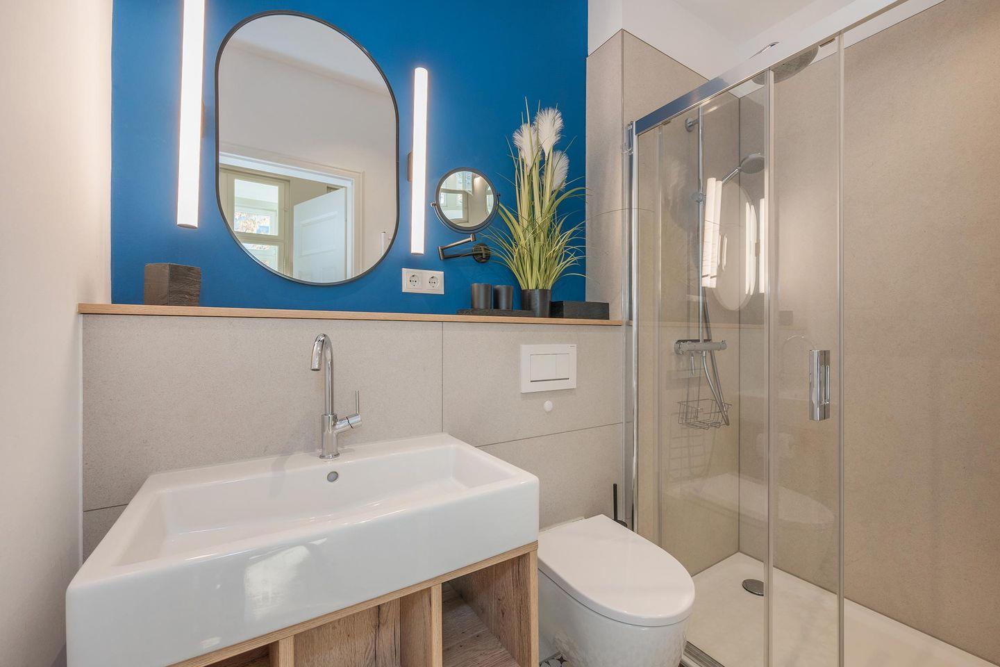 Im Badezimmer erwartet Sie neben einem WC, Waschbecken und einer Handtuchheizung auch eine bodengleiche Regendusche.