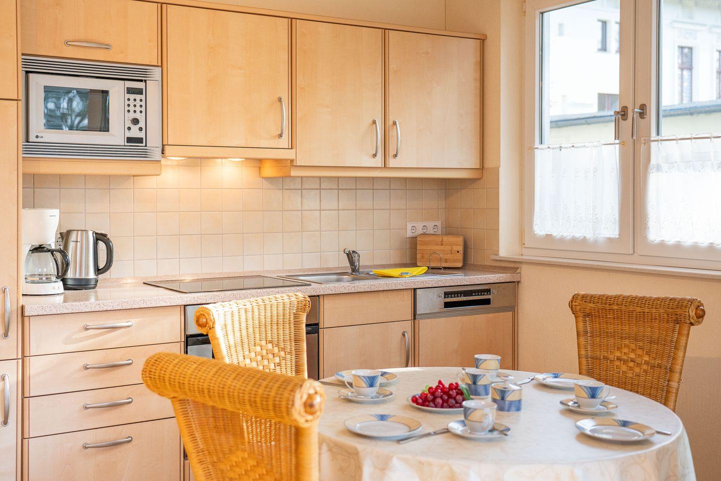 Im gemütlichen Schlafzimmer finden Sie ein komfortables Doppelbett, das für erholsame Nächte sorgt. Zusätzlich bietet das helle Wohnzimmer ein praktisches Schlafsofa, das bei Bedarf als zusätzliche Schlafgelegenheit dient – ideal für Familien mit Kindern oder Freunde, die gemeinsam verreisen. Der offene Schnitt zwischen Küche und Wohnzimmer schafft eine freundliche Atmosphäre, die zum gemeinsamen Kochen und Verweilen einlädt. Die voll ausgestattete Küche lässt mit modernen Geräten wie Backofen, Spülmaschine, Ceranfeld und Mikrowelle keine kulinarischen Wünsche offen.