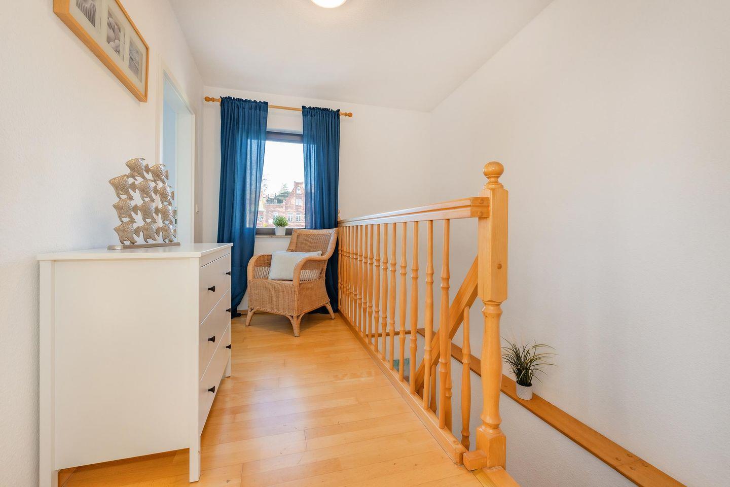 Ein besonderes Highlight der Wohnung sind die zwei vollwertigen Bäder, die sich jeweils auf einer Etage befinden. Während das Badezimmer im Erdgeschoss über eine Dusche verfügt, bietet das obere Bad eine Badewanne – ideal für Familien oder Paare, die Komfort und Flexibilität schätzen.