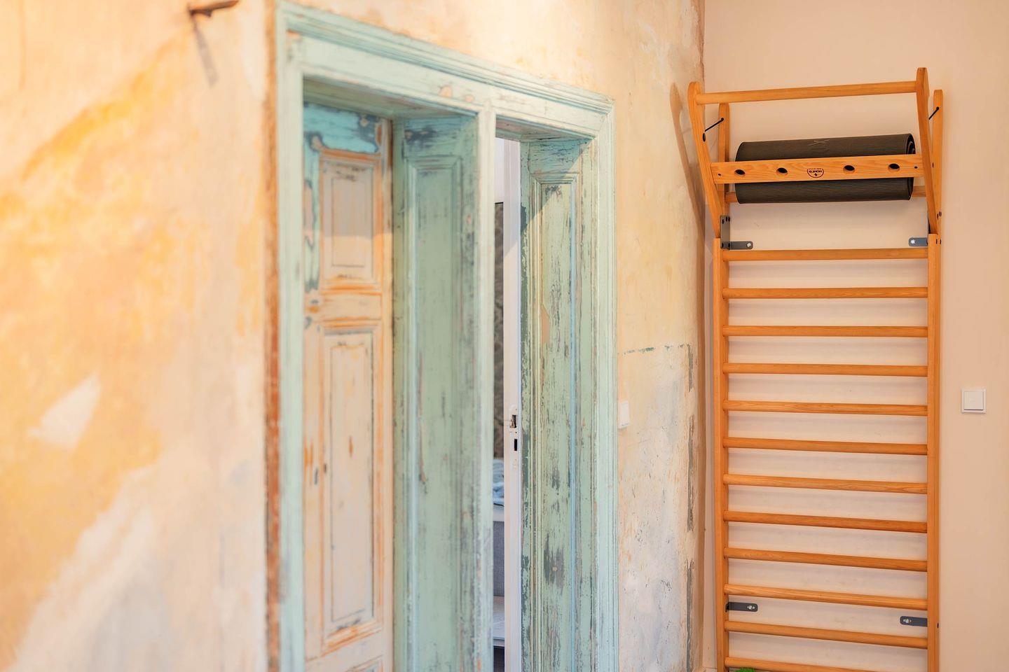 Die Innenarchitektur der Wohnung besticht durch eine helle, warmtonige Farbgestaltung, die in Verbindung mit hochwertigen Möbeln sofort eine einladende und freundliche Atmosphäre schafft. Die separate, zeitgemäße Küche ist ein gemütlicher Raum, der als Herzstück für gemeinsame Mahlzeiten dient. Hier finden Sie eine komplette Ausstattung mit allen notwendigen Geräten wie Ceran-Kochfeld, Backofen und Spülmaschine. Ein großer Esstisch in der Küche lädt die ganze Reisegruppe zum Verweilen ein. Der Wohnraum bietet eine komfortable Sitzecke und einen Flat-TV, über den Sie dank Streaming-Zugängen wie Amazon Prime und Netflix (mit eigenem Account) bestens unterhalten werden. Ein Schlafsofa im Wohnbereich bietet flexible Übernachtungsmöglichkeiten. Ein außergewöhnliches Detail ist der Aktivbereich im Flur mit einer Sprossenwand und einer Yoga-Matte – ideal für eine kleine Sporteinheit oder meditative Übungen.