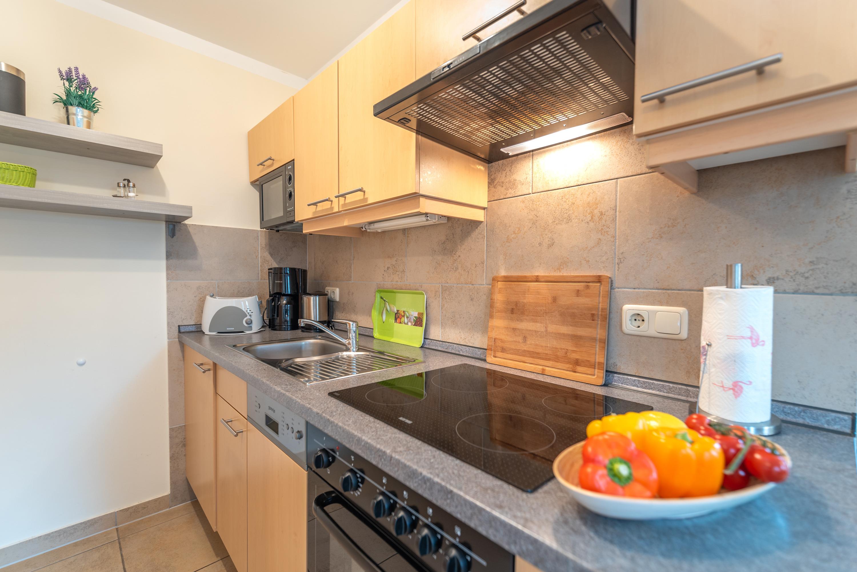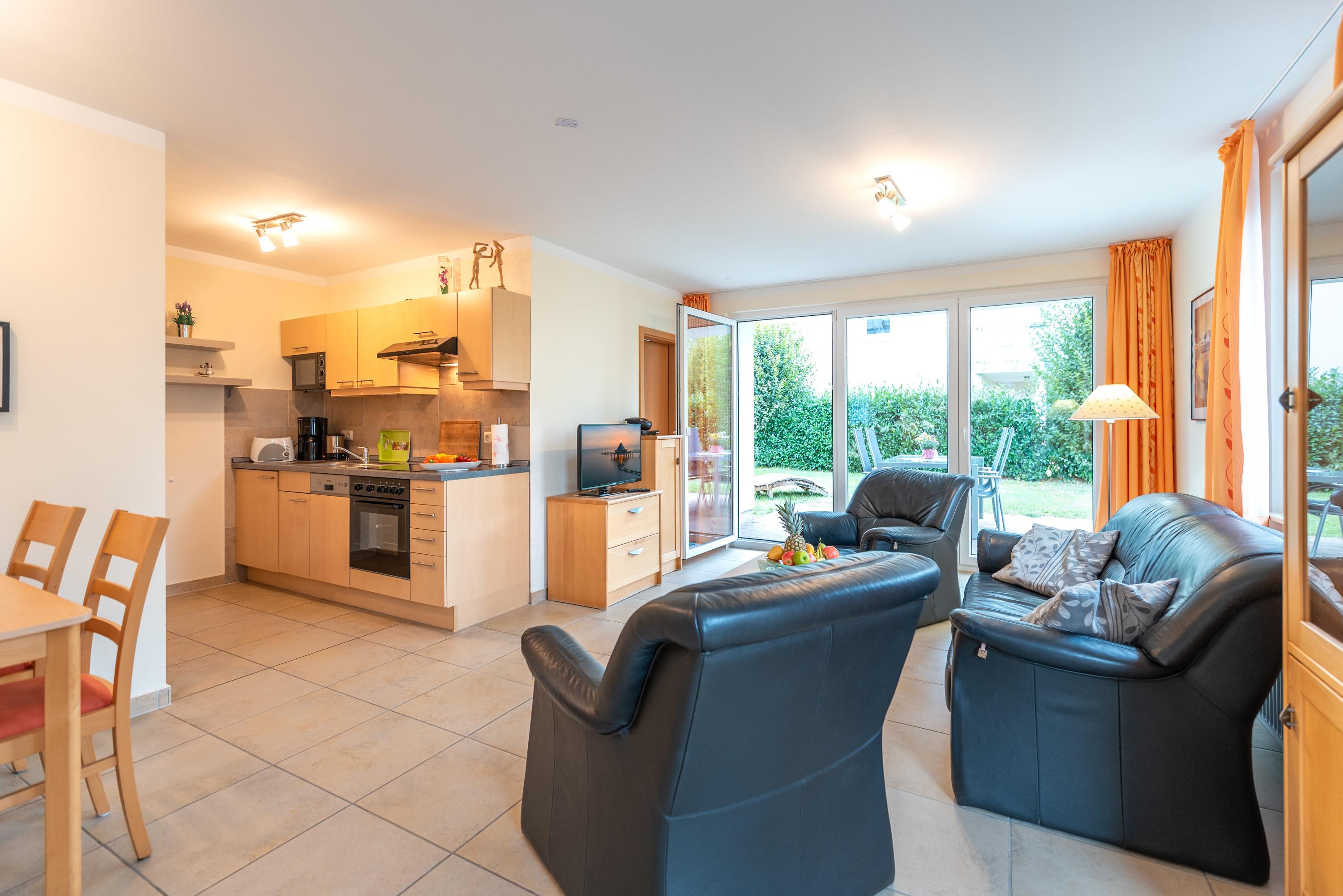 Der helle, freundlich gestaltete Wohnbereich ist gefliest und verfügt über eine vollständig ausgestattete Küchenzeile, in der Sie problemlos eigene Mahlzeiten zubereiten können.