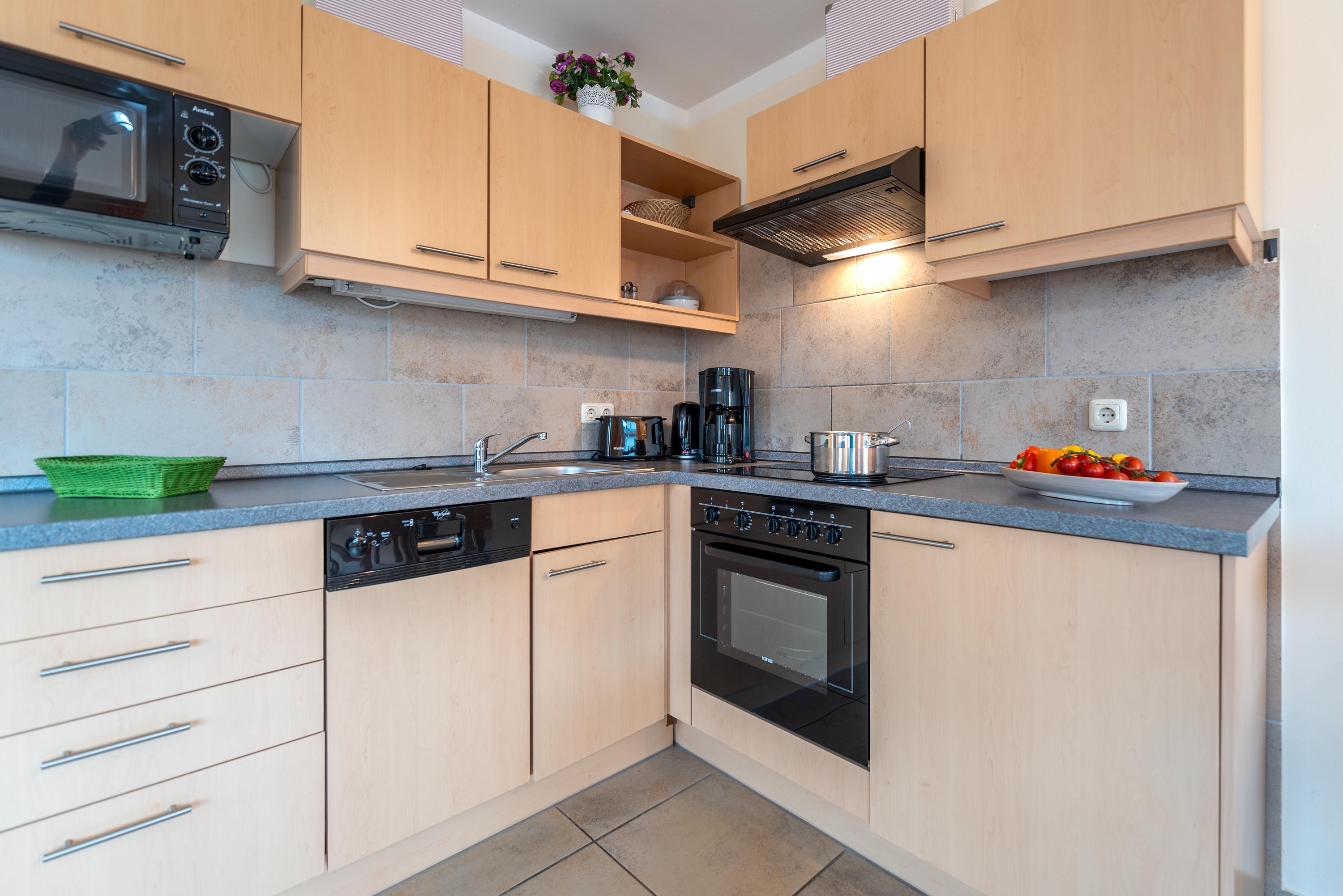 Der helle Wohnbereich ist geschmackvoll eingerichtet und komplett gefliest. Eine vollständig ausgestattete Küchenzeile macht die Zubereitung eigener Mahlzeiten bequem und unkompliziert.