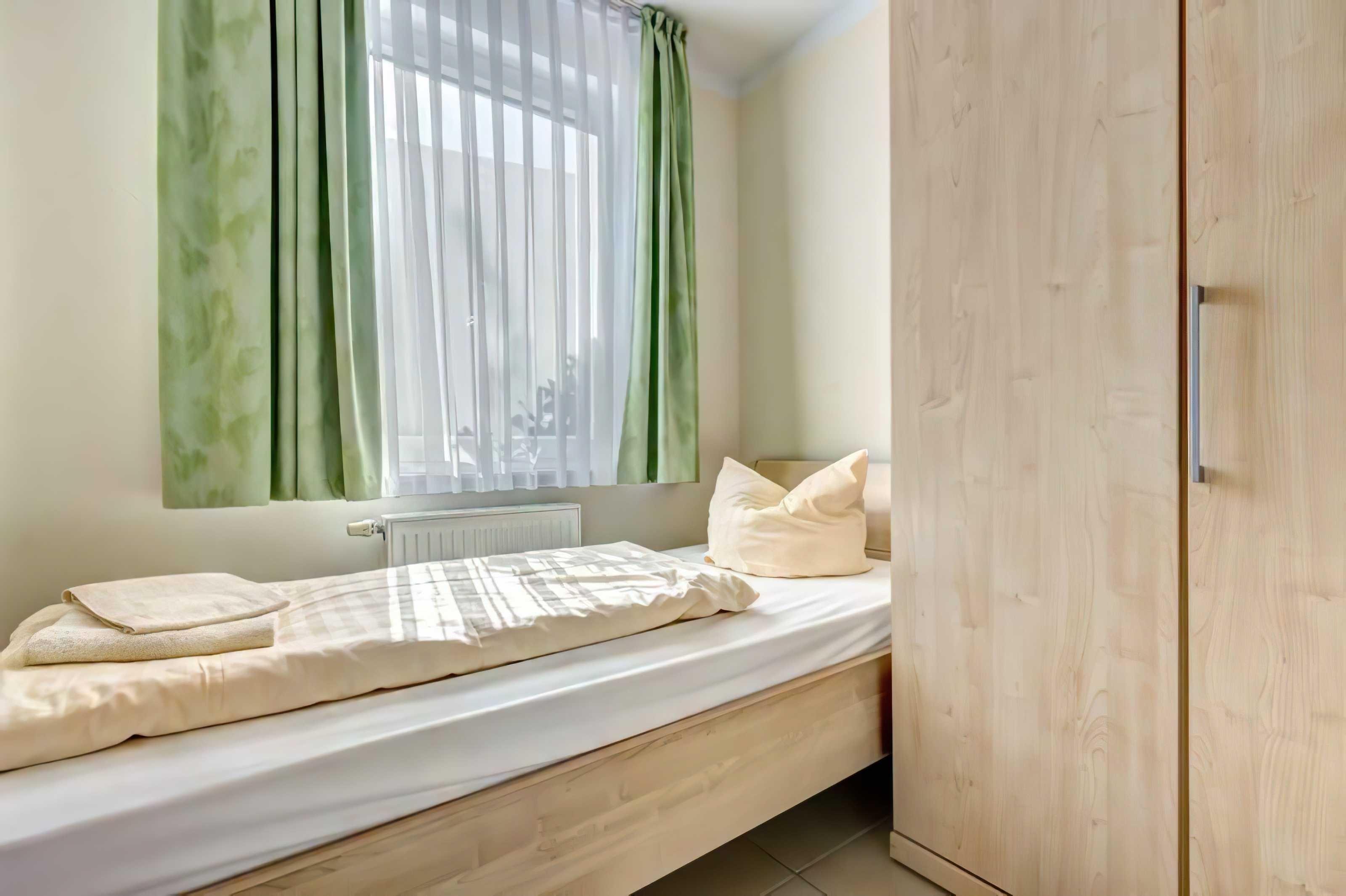 Die Unterkunft verfügt über zwei separate Schlafzimmer und eignet sich perfekt für Familien oder Paare, die gemeinsam reisen und dennoch Privatsphäre genießen möchten. Ein Schlafzimmer ist mit einem Doppelbett ausgestattet, während das zweite Schlafzimmer über zwei Einzelbetten verfügt. Der helle Wohnbereich lädt zum Entspannen ein und bietet ausreichend Platz für gemütliche Abende. Von hier aus gelangen Sie direkt auf die Terrasse mit Sitzmöglichkeiten für bis zu vier Personen – ideal für ein Frühstück im Freien oder entspannte Stunden nach einem Strandtag.