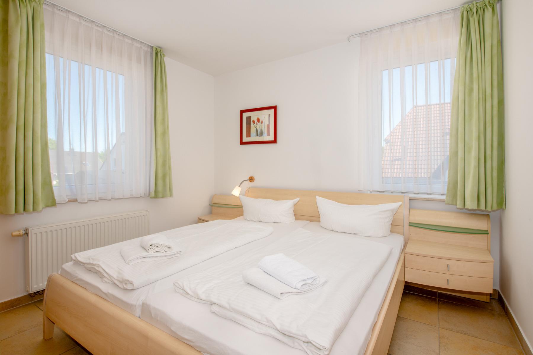 Moderne und funktional eingerichtete Ferienwohnungen im Obergeschoss mit ca. 65 m² Wohnfläche bieten Platz für bis zu 4 Personen. Jede Wohnung verfügt über zwei separate Schlafzimmer – eines mit Doppelbett und eines mit zwei Einzelbetten – sowie ein Badezimmer mit Dusche und WC. Der helle Wohn- und Essbereich mit voll ausgestatteter Küche sorgt für Komfort und Flexibilität. Ein Balkon ergänzt die Ausstattung und lädt zum Entspannen ein. Ideal für Familien und kleine Gruppen.