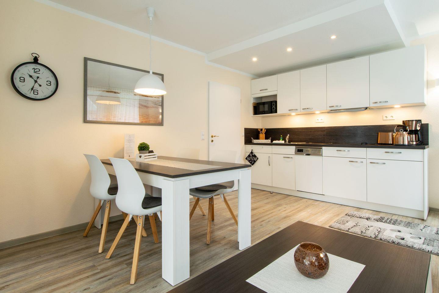 Das Apartment beinhaltet eine voll ausgestattete offene Küche mit Wasserkocher, Kaffeemaschine, Toaster, Herd mit Ceranfeld, Geschirrspüler, Mikrowelle und einer Kühl- und Gefrierschrankkombination.
