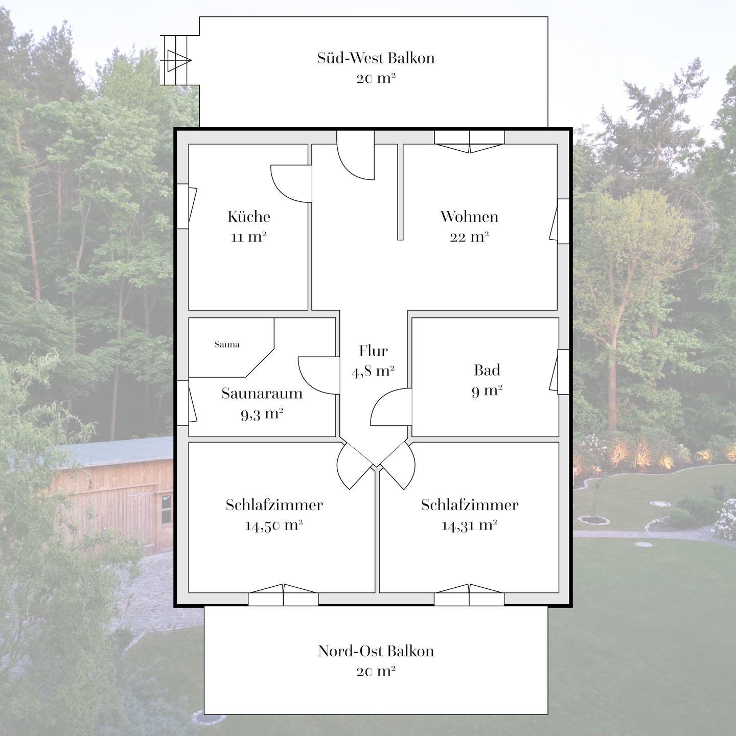 Die Wohnung verfügt über eine Wohnküche, einem großen Wohnzimmer, einem modern ausgestattetem Wellness-Bad, zwei Schlafzimmer mit 180 cm breiten Doppelbetten und einem Raum mit der privaten Sauna (2€ / Stunde). Zusätzlich gibt es zwei große Balkone - hier findet ihr schöne Plätze zum Essen unter freiem Himmel oder für eine kleine Entspannungspause.