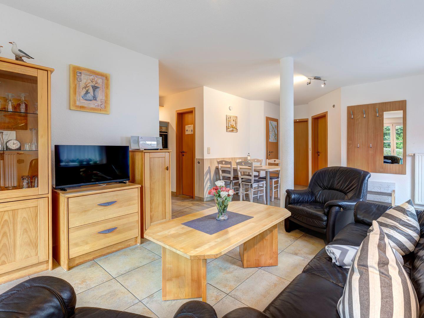Mit einer sonnigen Terrasse und Platz bis zu 4 Personen lädt die 62 m²große Wohnung im Erdgeschoss zum Verweilen ein. Die modern ausgestattete Küche lässt keine Wünsche offen. Entspannen Sie im hellen Wohnzimmer bei einem guten Buch oder genießen Sie kulinarische Köstlichkeiten aus der Region. Die zwei Schlafzimmer – eines mit Doppelbett, das andere mit zwei Einzelbetten – garantieren erholsame Nächte.
