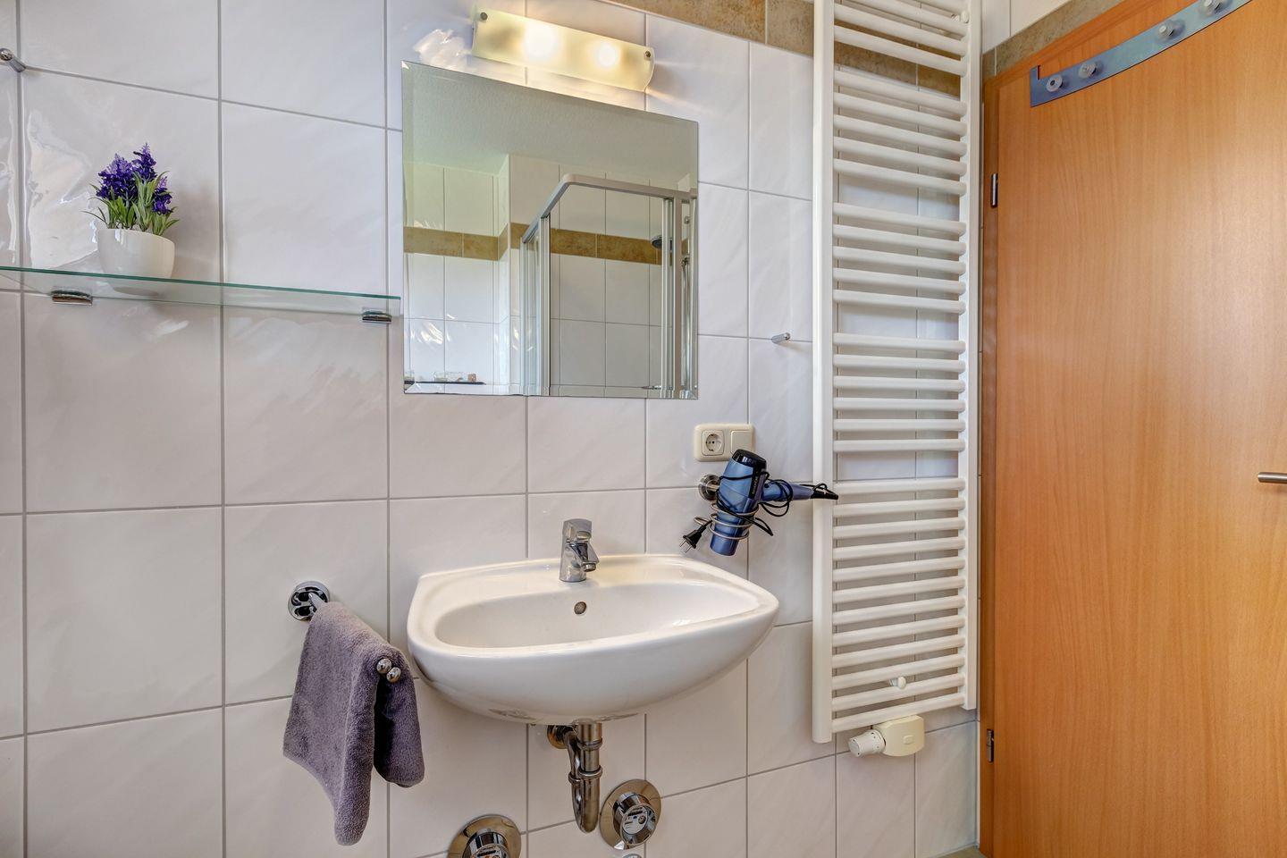 Ein modernes Badezimmer und eine Sauna laden Sie zu einer „kleinen Wellness-Auszeit“ ein.