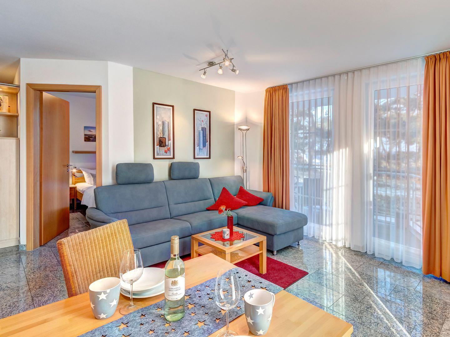Willkommen in der stilvollen Wohnung GP04 im ersten Stock unserer 5-Sterne-DTV-zertifizierten Wohnanlage. Der helle Wohnbereich mit bequemer Sitzgruppe schafft eine gemütliche Atmosphäre und bietet direkten Zugang zum Balkon mit hochwertigen Gartenmöbeln – ideal für ein Frühstück im Freien oder einen entspannten Tagesausklang. Die moderne, voll ausgestattete Küche bietet alles für genussvolle Mahlzeiten. Zwei Schlafzimmer mit Doppelbetten und TV laden zum Ausruhen ein. Ein Bad mit Wanne sowie ein Gäste-WC stehen zur Verfügung. Dank Fahrstuhl ist die Wohnung auch für Gäste mit Gepäck oder eingeschränkter Mobilität bequem erreichbar.