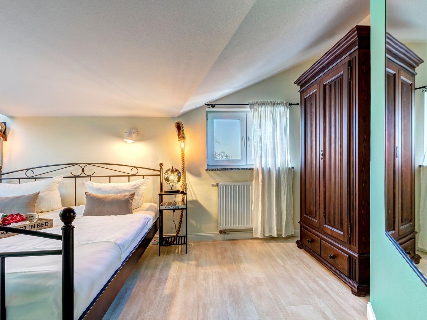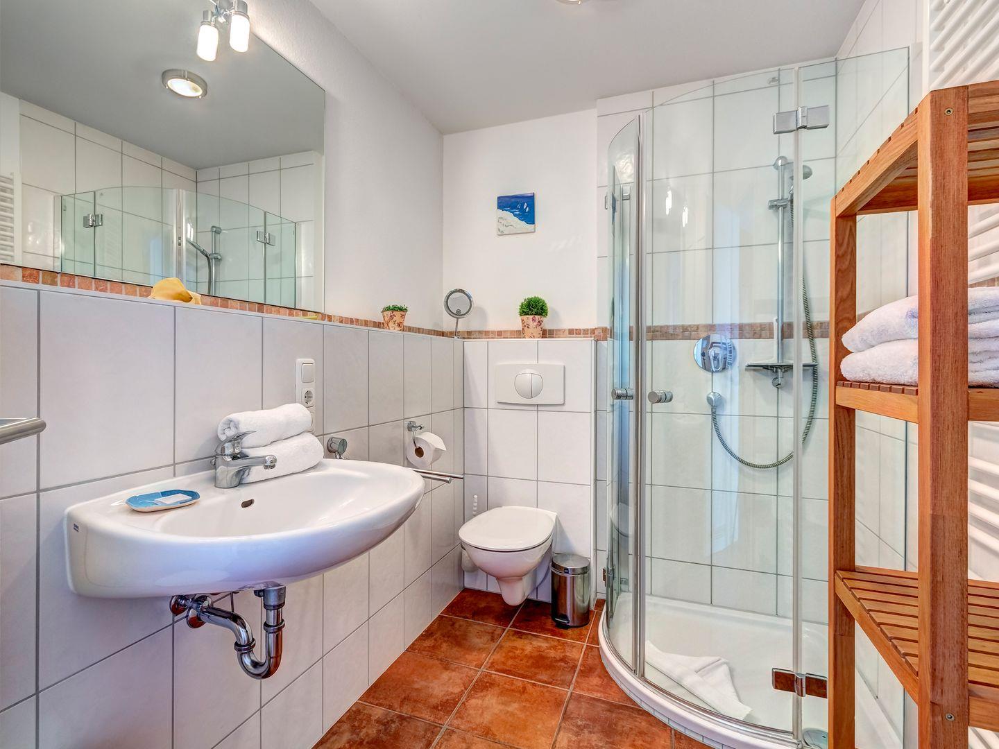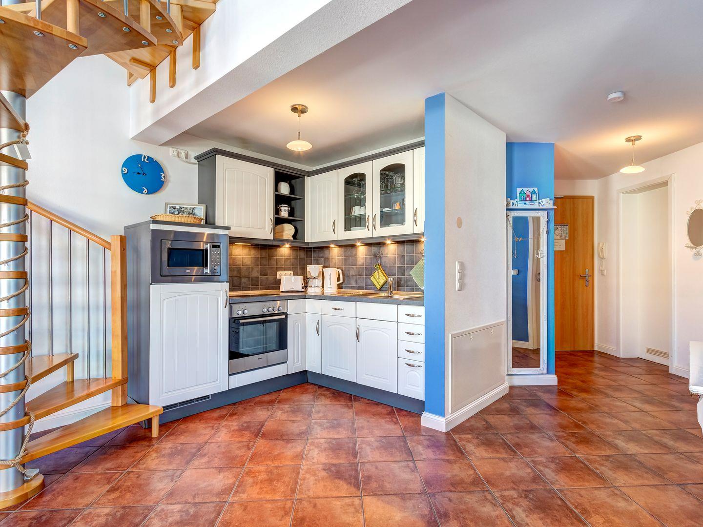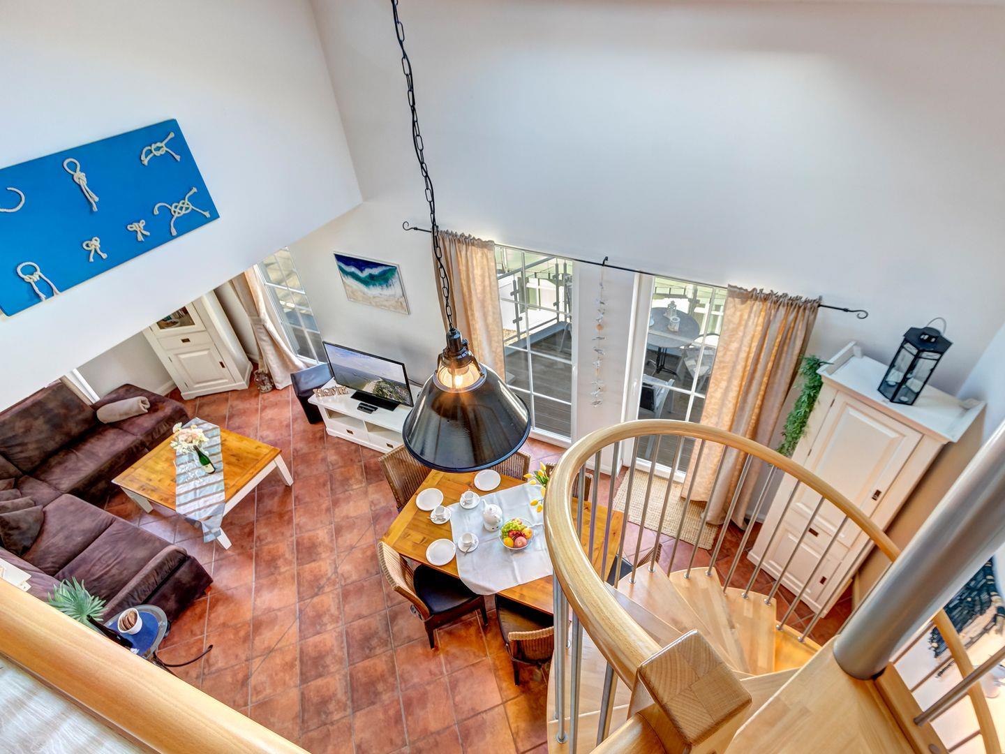 Die im 3. Obergeschoss und Dachgeschoss einer Wohnanlage gelegene, mit 5-DTV-Sternen ausgezeichnete Ferienwohnung bietet exklusiven Komfort auf 103 m², verteilt auf 2 Wohnebenen mit Galerie. Mit 3 vollwertigen Schlafzimmern bietet sie Platz für bis zu 6 Personen – ideal für größere Familien oder Gruppen. Zwei südlich ausgerichtete Balkone laden zum Verweilen ein. Die zweite Wohnebene, erreichbar über eine Wendeltreppe, umfasst separate Schlafräume, ein eigenes Bad sowie einen eigenen Eingang. Terracottafußböden in den Wohnbereichen und hochwertiges Parkett in den Schlafzimmern schaffen ein südländisches Flair.