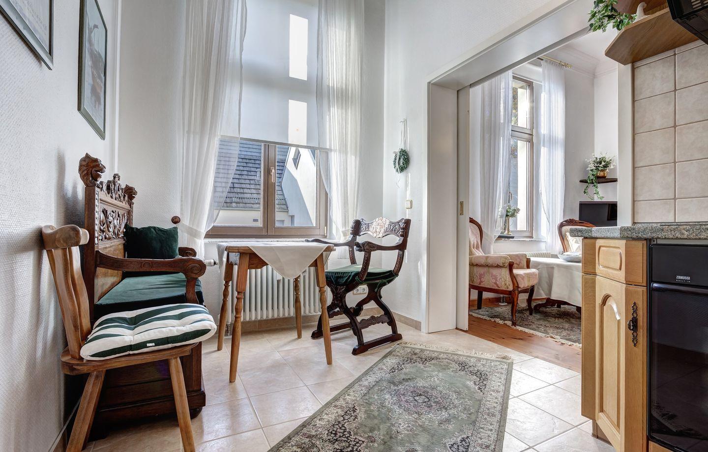 Der großzügig gestaltete Wohnbereich ist funktional eingerichtet und verfügt über einen gemütlichen Sessel sowie einen Esstisch, der sich bestens für gemeinsame Mahlzeiten eignet. Die geschlossene Küche ist zeitgemäß ausgestattet und bietet Ihnen alle notwendigen Geräte für die Selbstversorgung: Neben einem Herd sind auch ein Backofen, eine Mikrowelle, eine Kaffeemaschine sowie ein Kühlschrank mit integriertem Gefrierfach vorhanden.