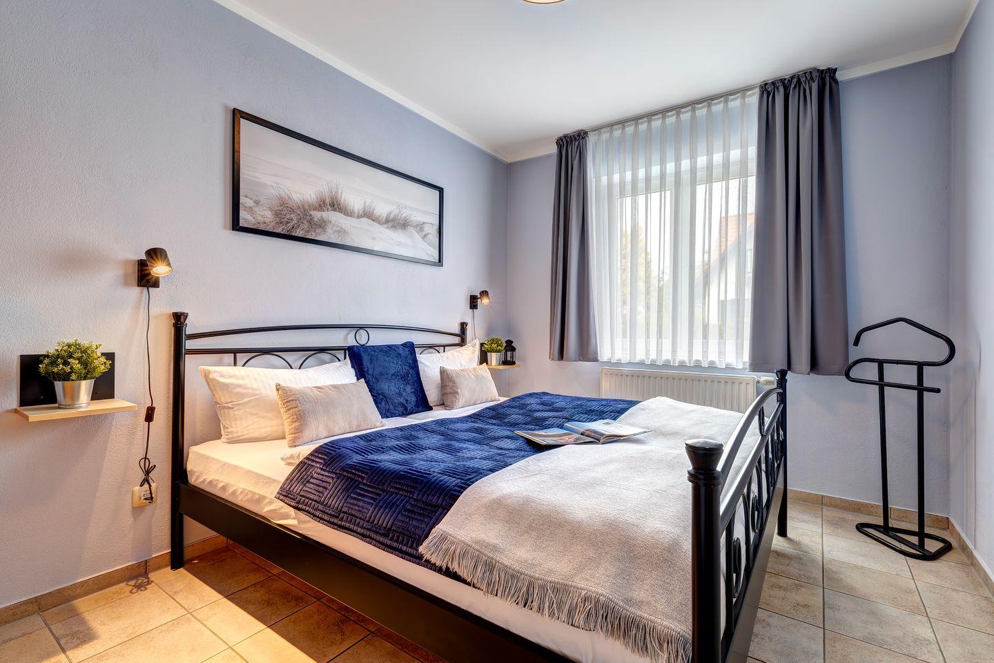 Das angrenzende Schlafzimmer verfügt über ein komfortables Doppelbett, einen geräumigen Kleiderschrank und Verdunklungsmöglichkeiten für erholsame Nächte.
