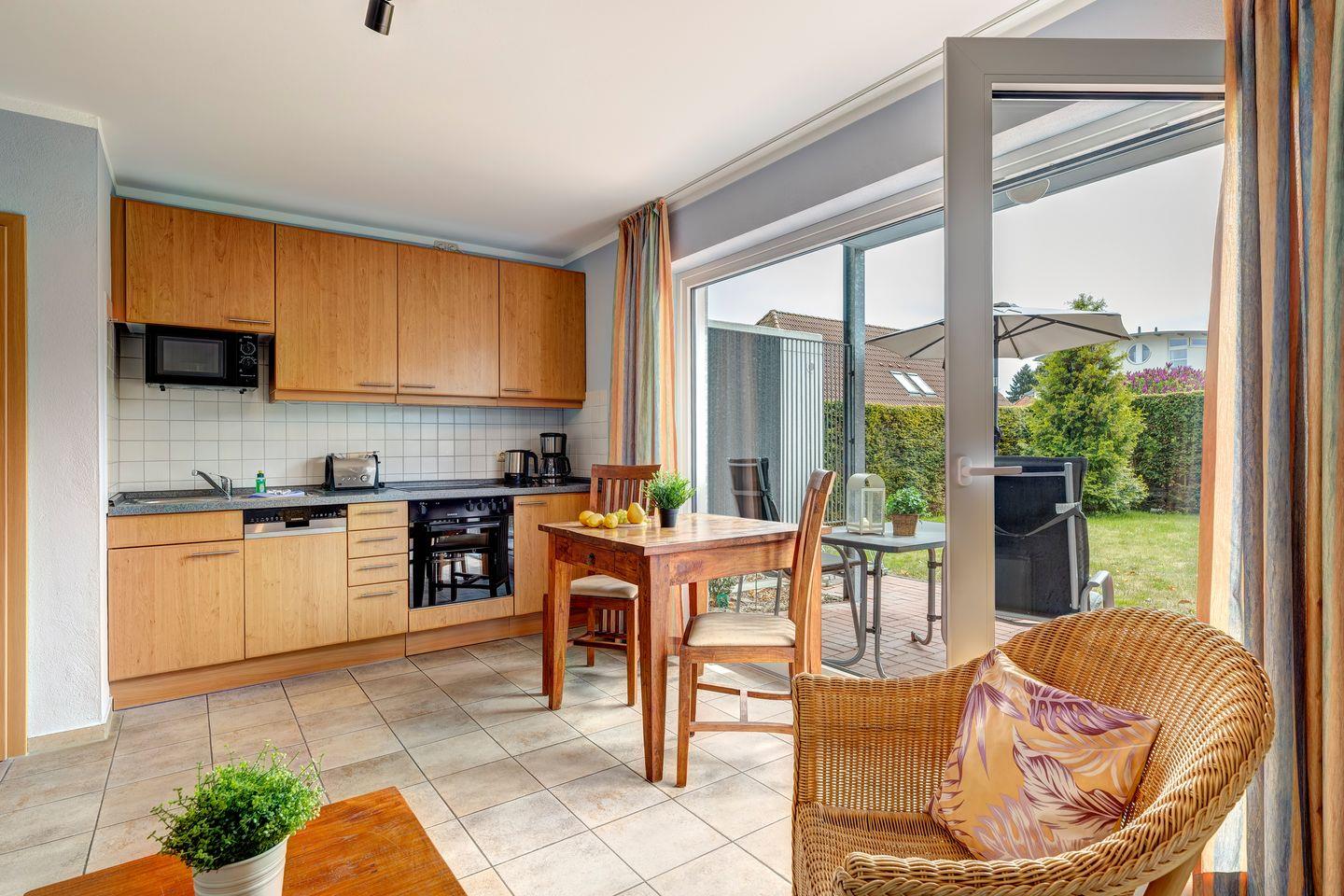 Die Ferienwohnung "Am Sonnengarten 4" bietet Platz für bis zu zwei Personen und befindet sich im Erdgeschoss. Dort erwartet Sie ein gemütlicher Wohnbereich mit Sofa, der nahtlos in einen offenen Essbereich übergeht. Die moderne Küche ist vollständig ausgestattet und lässt keine Wünsche offen.
