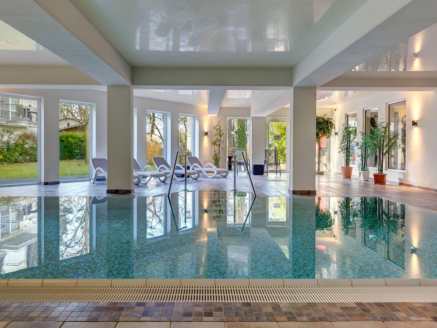 Draußen lockt der abgeschlossene Gemeinschaftsgarten mit Liegewiese, Gartenmöbeln, Trampolin, Kohlegrill und Tischtennisplatte. Ein überdachter Balkon oder Terrasse ermöglicht wetterunabhängiges Entspannen. Besonders hervorzuheben ist der umfassende Wellnessbereich mit hauseigener Sauna, beheiztem Indoor-Pool, Infrarotkabine, Außendusche, Fitnessraum und Ruheraum.
