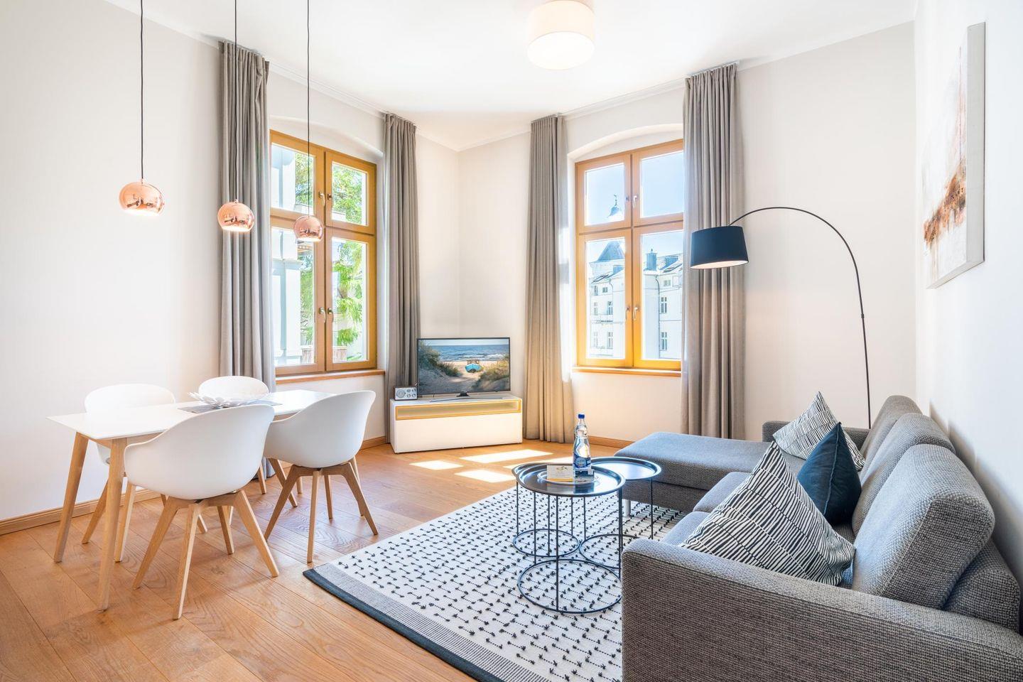 Auch auf dieser Etage sorgen die hohen, lichtdurchfluteten Räume für eine Wohnatmosphäre der ganz besonderen Art. In der Villa Marie wurde der Charakter des alten Hauses geschmackvoll kombiniert mit den modernen Ansprüchen von heute. Im großzügigen Wohnzimmer gibt es neben einer gemütlichen Sitzecke einen modernen Smart-TV, der ein vielfältiges Unterhaltungsprogramm garantiert. Eine Schlafcouch bietet Platz für einen dritten Übernachtungsgast. Die moderne Einbauküche ist mit hochwertigen Markengeräten ausgestattet und lässt kaum einen Wunsch offen. Ein schöner Essplatz befindet sich in unmittelbarer Reichweite.