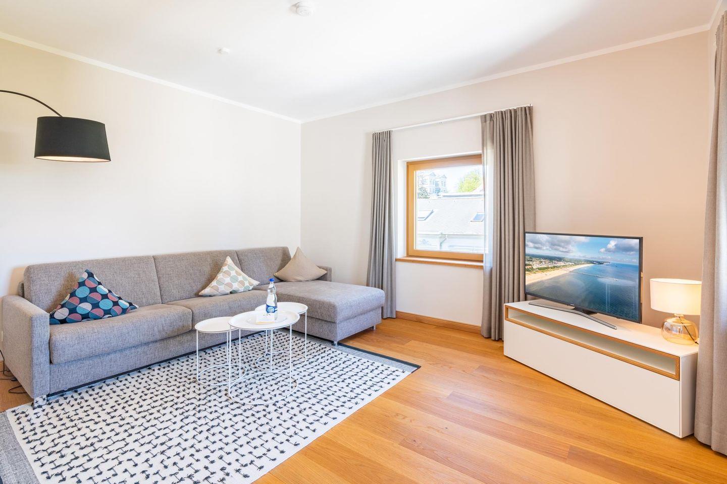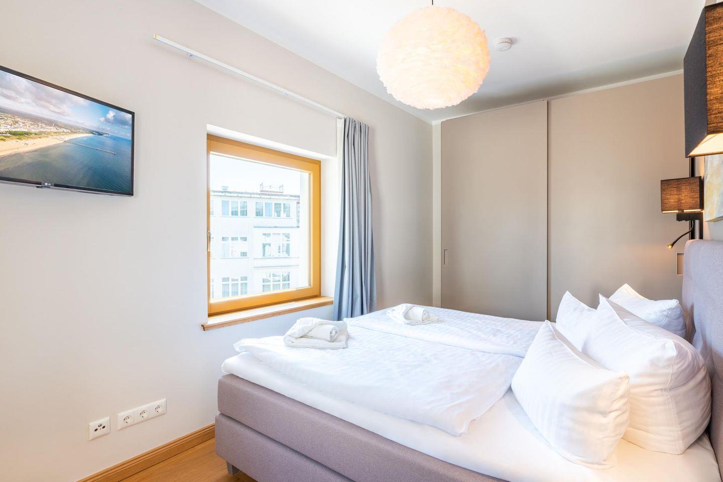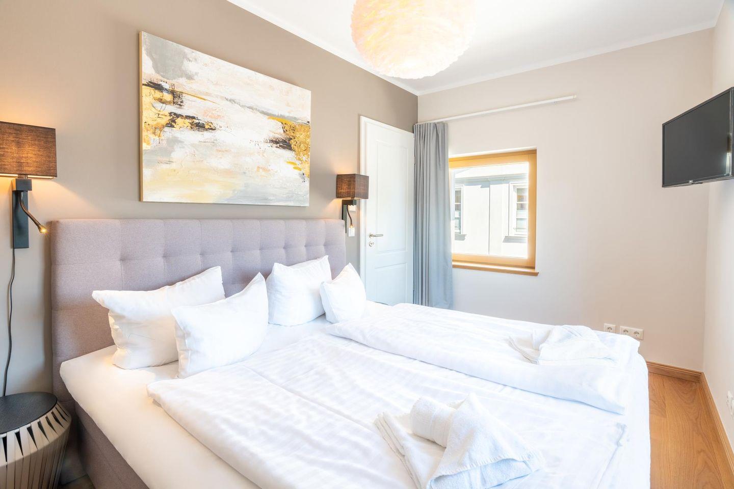 Das separate Schlafzimmer verfügt neben einem hochwertigen Box-Springbett über einen Smart-TV. Die hochwertige Sitzgarnitur im Wohnzimmer ermöglicht geruhsamen Schlaf für zwei weitere Gäste. Das Wohnzimmer kann durch eine Tür verschlossen werden und stellt somit einen vollwertigen Schlafraum dar. Damit Sie Ihren Aufenthalt von Beginn an genießen können, sind die Betten bei Ihrer Ankunft bereits bezogen.