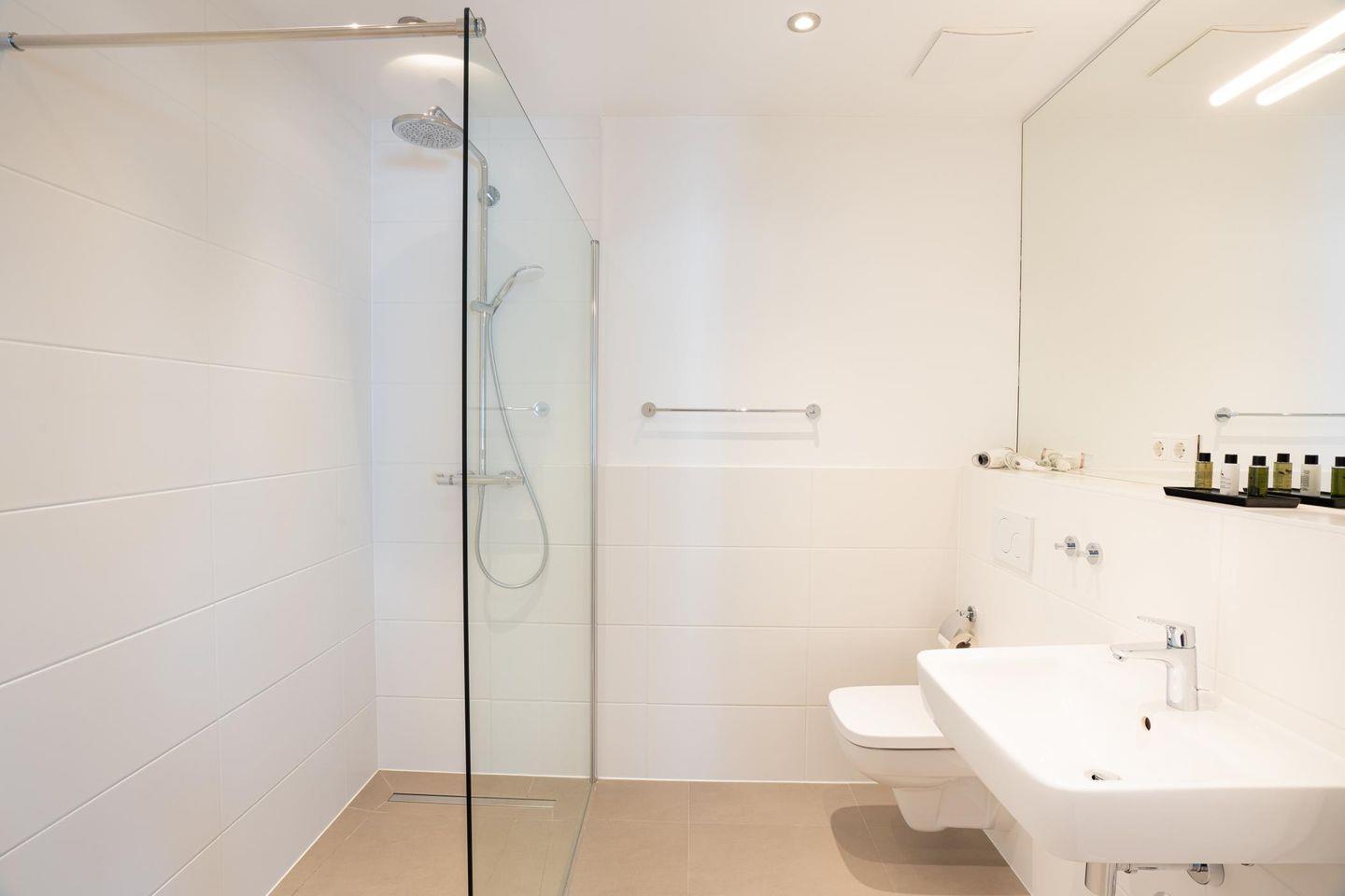 Eine sogenannte 'Walk-In-Dusche' lockt auch den überzeugten Langschläfer aus den Federn. Im Badezimmer liegen neben Handtüchern auch Pflegeprodukte bereit. Ausgestattet ist das Duschbad mit Waschbecken, WC und einem Handtuchhalter-Heizkörper.