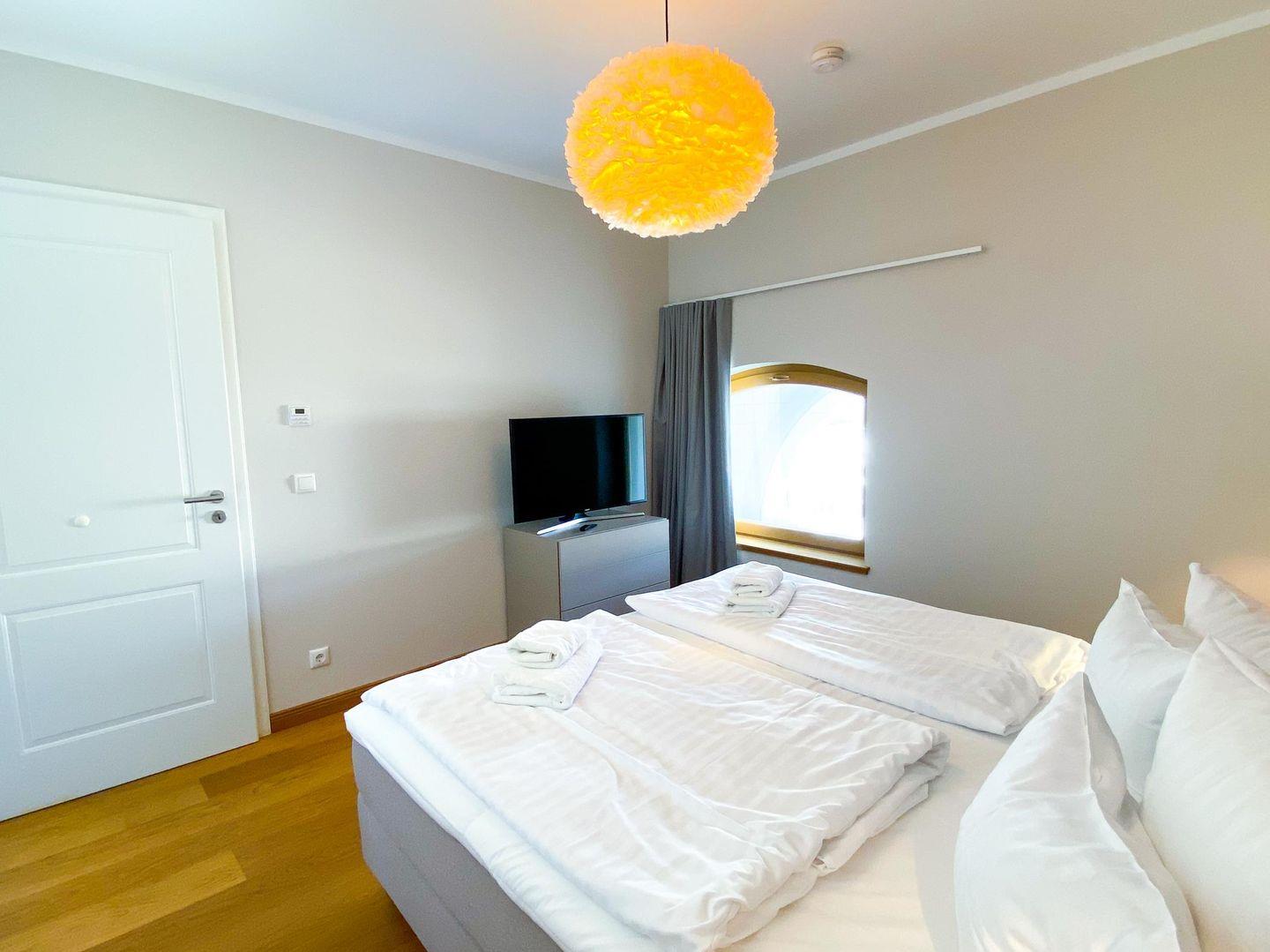 Auch hier gehört ein Smart-TV neben einem hochwertigen Box-Springbett und einem geräumigen Wandschrank zur Ausstattung.