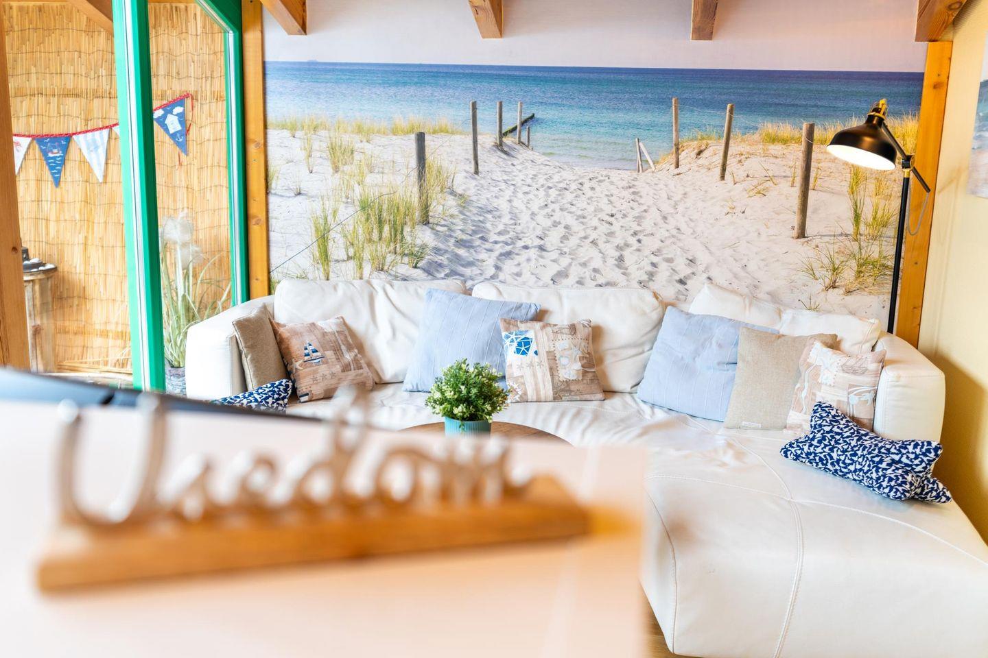 Der offene Wohnraum erstrahlt durch die große Fensterfront in hellem Licht. In der komfortablen Sitzecke lassen sich gemütliche Abendstunden verbringen. Die großzügige Wohnküche lädt zum Kochen und Backen ein. Am Tisch ist Platz für zwei Personen und für ausgedehnte Spielabende, das perfekte Urlaubsdinner oder den Laptop. Mit dieser Wohnung haben Sie außerdem Ihre eigene kleine Urlaubs-Oase gefunden: blick- und windgeschützt können Sie auf der Dachterrasse bis in den Herbst hinein viele Stunden im Freien verbringen.