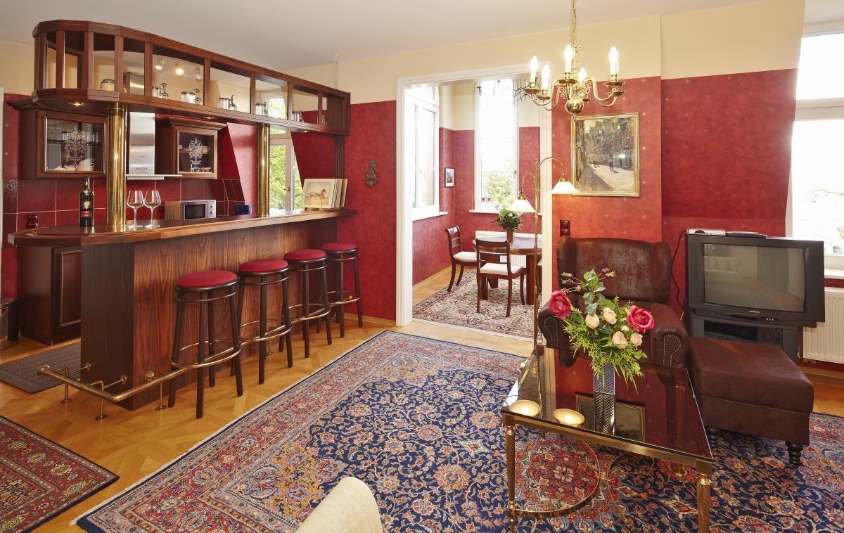 Als "Zeitsprung" beschrieb jüngst ein Gast seinen Aufenthalt in der knapp 70m² umfassenden Ferienwohnung. Die gediegenen hochwertigen Möbel erinnern in der Tat an die alte Zeit. Doch auch die moderne Technik von heute hat Einzug gehalten: neben zwei Flachbild-Fernsehern runden ein WLAN-Anschluss sowie eine moderne Musikanlage von Bose das Unterhaltungsangebot ab. Der großzügige Wohnbereich unterteilt sich in die gemütliche Sitzecke sowie in eine integrierte Küchenzeile mit Theke - und auch vom Küchenfenster genießen Sie den Meerblick. Vom Wohnraum aus betreten Sie das "herrschaftliche" Turmzimmer: hier kann gegessen, gelesen oder einfach nur geträumt werden... Die Wohnung befindet sich im 3. Obergeschoss des Hauses und ist daher für Gäste mit Gehbehinderungen oder für kleine Gäste nur bedingt geeignet. Hinter dem Haus befindet sich ein PKW-Stellplatz.