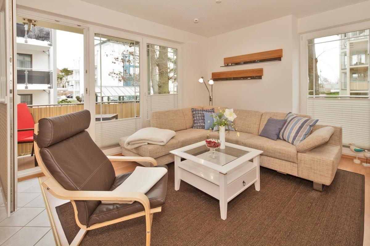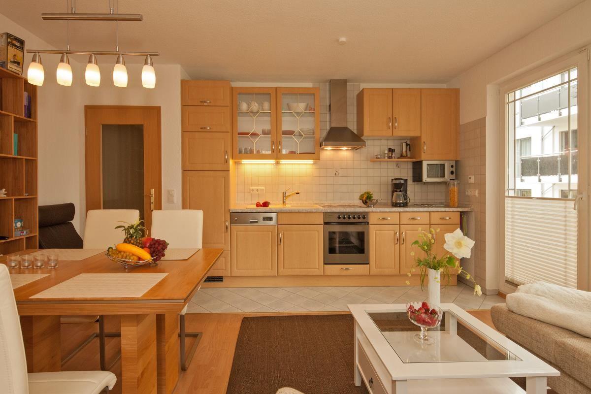 Das Wohnzimmer ist mit einer gemütlichen Sitzecke ausgestattet. Von hier aus betreten Sie einen der beiden geschützten Balkone. Im Wohnraum befindet sich auch die integrierte Küchenzeile, die kaum einen Wunsch offen läßt. Die separate Essecke befindet sich neben der schönen Anrichte - alles Möbel aus Echtholz.