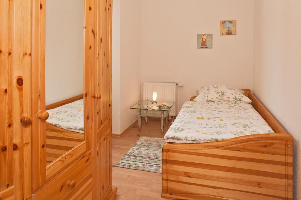 Im größeren der beiden Schlafzimmer steht ein Doppelbett sowie ein geräumiger Kleiderschrank. Die bodentiefen Fenster lassen sich durch Plissee-Rollos gut verdunkeln. In dem kleineren Schlafraum befindet sich ein Einzelbett, unter dem eine zusätzliche Matratze ausgezogen werden kann. Geeignet ist dieses Zimmer für zwei Kinder oder einen erwachsenen Gast. Auch steht ein Kleiderschrank.