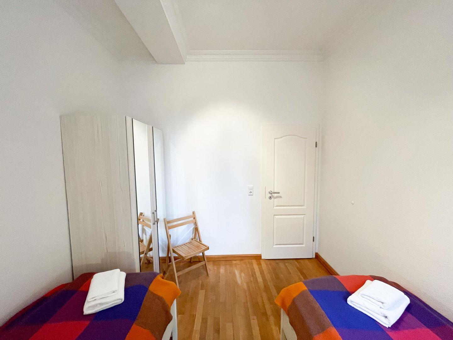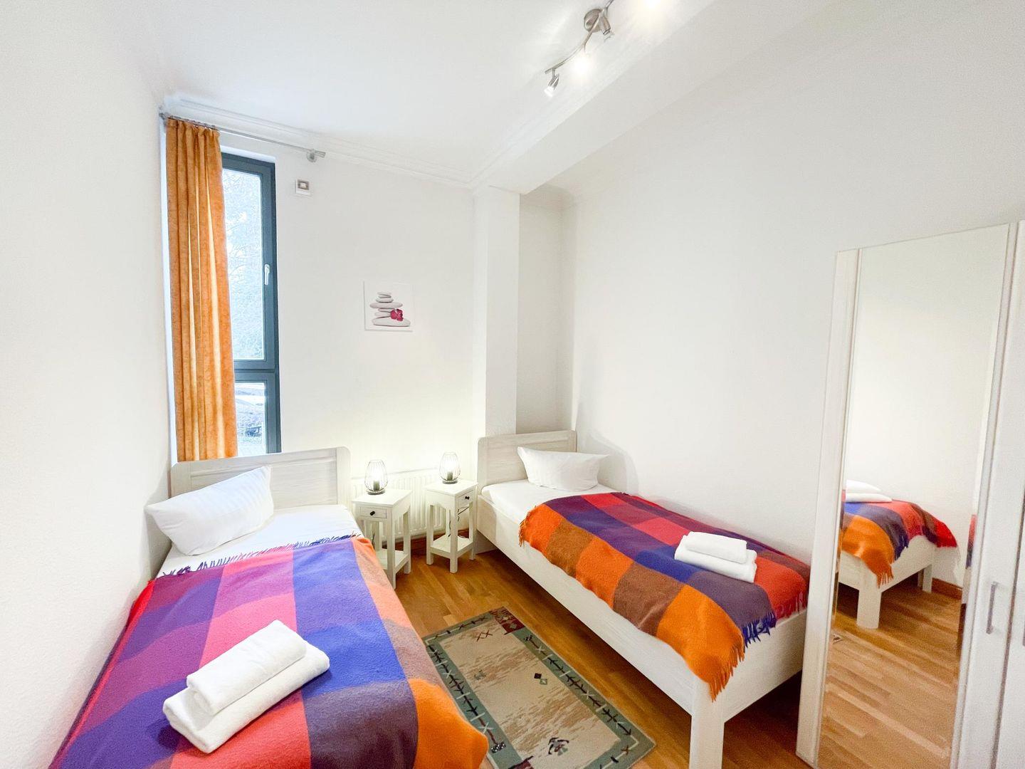 Das größere der beiden Schlafzimmer verfügt über ein Doppelbett; im kleineren Schlafzimmer stehen zwei Einzelbetten. Somit ist die Wohnung sowohl für eine kleine Gruppe von bis zu 4 Erwachsenen als auch für eine Familie mit 2 Kindern gleichermaßen geeignet.