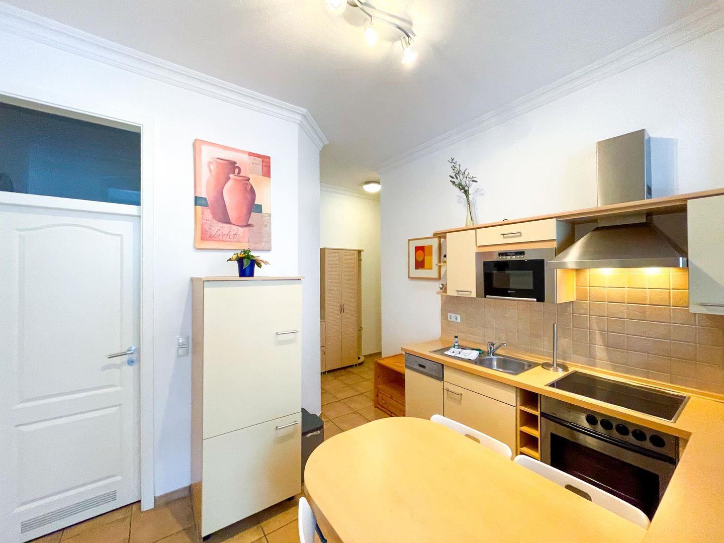 Der Wohnbereich bietet eine gemütliche Sitzecke, von der die Küche optisch durch eine kleine Mauer getrennt ist. In unmittelbarer Nähe der Küchenzeile befindet sich auch der Esstisch. Die Wege von der Villa Perkunos ins Zentrum, zum Strand (ca. 400 Meter) und zur berühmten Seebrücke von Heringsdorf mit seiner Ladenzeile sind kurz. Somit eignet sich die Ferienwohnung gleichermaßen für einem Kurzaufenthalt über das Wochenende wie auch für den mehrwöchigen Sommerurlaub mit der Familie.