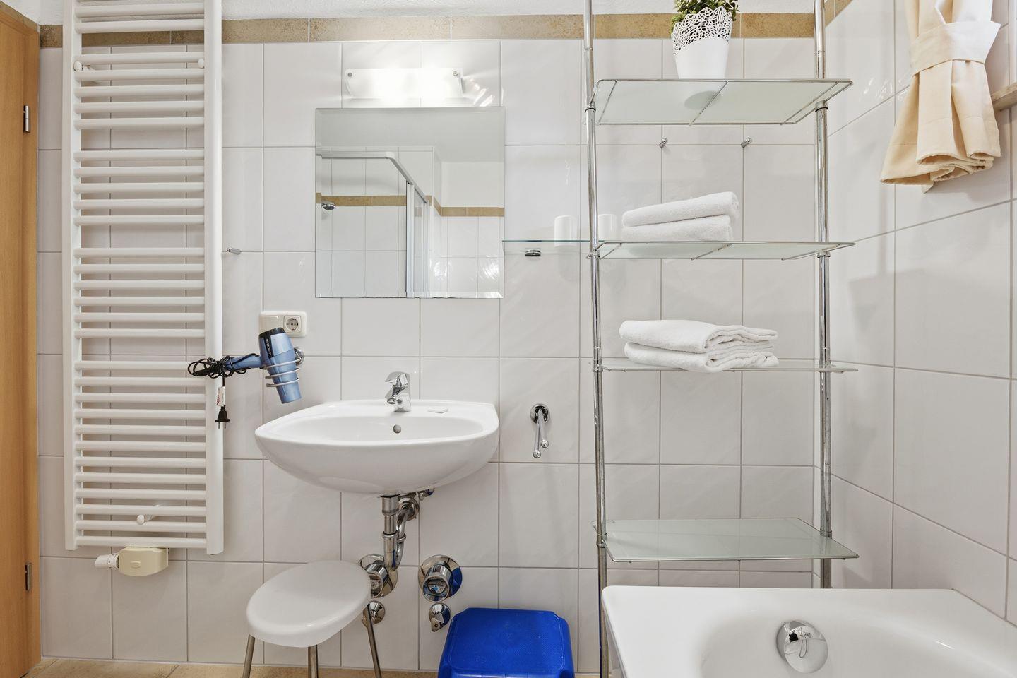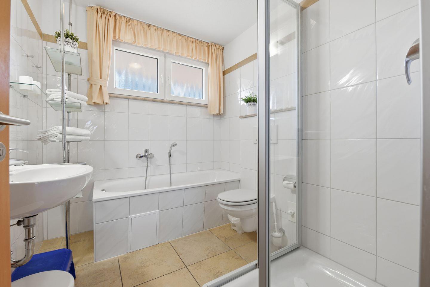 Im Badezimmer erwarten Sie eine komfortable offene Dusche, eine separate Badewanne, ein Waschbecken, WC, Spiegel sowie ein Haartrockner. Warme Handtücher und sanitäre Ausstattung stehen Ihnen selbstverständlich zur Verfügung. Alle Fenster sind mit Sichtschutz ausgestattet.