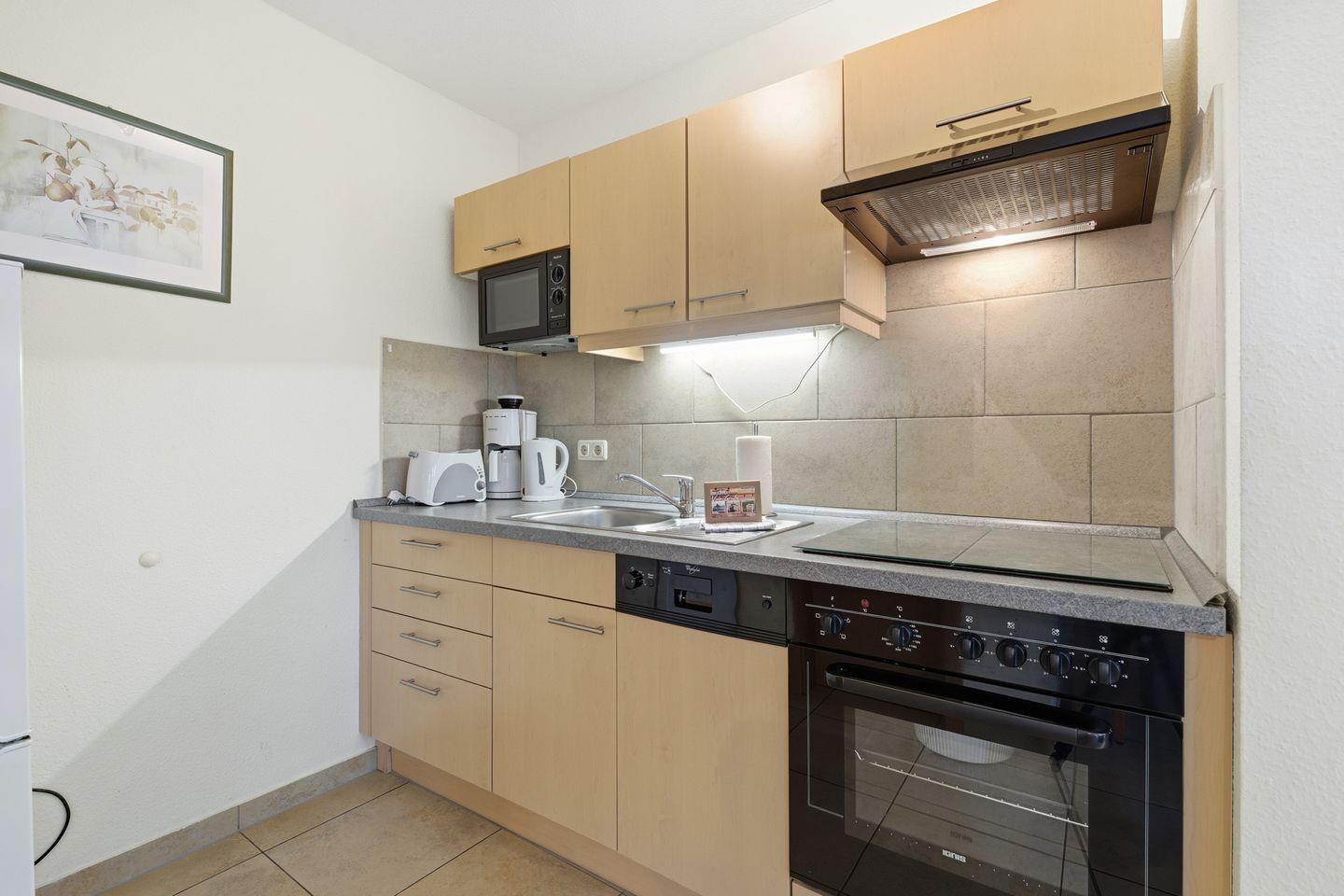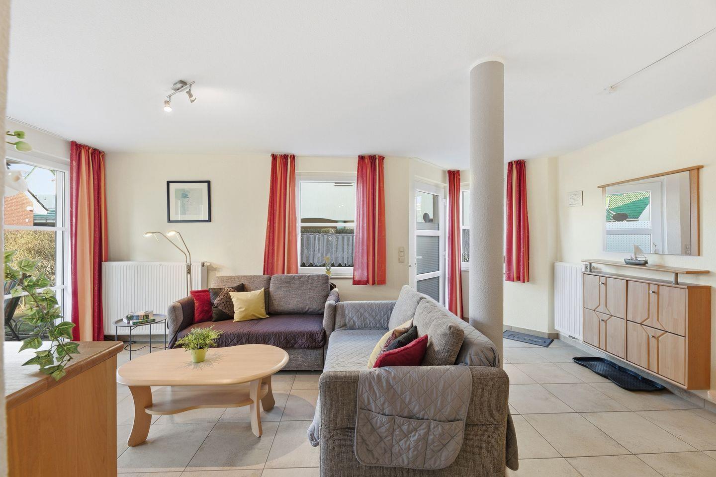 Die Wohnung umfasst zwei separate Schlafzimmer mit Fliesenboden, in denen hochwertiges Bettzeug bereitliegt. Das Wohnzimmer ist offen und großzügig gestaltet. Hier laden ein bequemes Sofa und ein Sessel zum Entspannen nach einem erlebnisreichen Tag am Meer ein. Die angrenzende offene Küche ist vollständig ausgestattet: Sie finden einen 4-Platten-Herd, einen Backofen, Kühlschrank mit zusätzlichem Gefrierschrank, Spülmaschine, Mikrowelle, Toaster, Kaffeemaschine, Wasserkocher und einen Eierkocher. Für die gemeinsame Mahlzeit steht ein Esstisch zur Verfügung. Praktische Küchenutensilien sowie Geschirr und Besteck sind in ausreichender Anzahl vorhanden. Ein offener Essbereich und ein einladender Wohnraum mit TV, Radio und CD-Spieler bieten vielfältige Unterhaltungsmöglichkeiten. Für einen angenehmen Aufenthalt sorgen ebenfalls kostenloses WLAN, eine Erstausstattung an Handtüchern, Bettwäsche, Geschirrhandtüchern und ein Staubsauger.