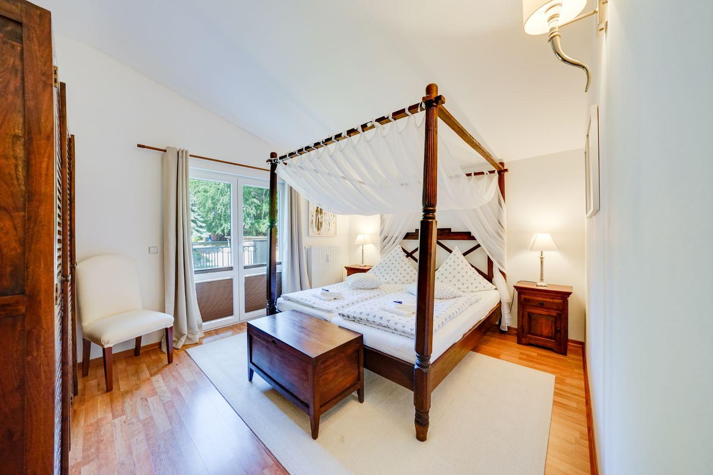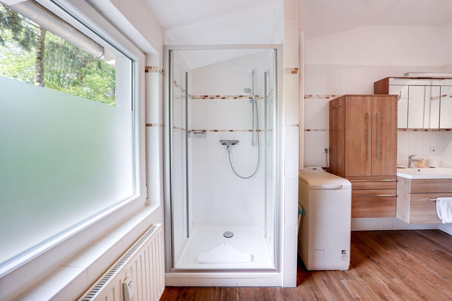Im Obergeschoss bietet eine helle, weitläufige Wohnung mit 100 qm für vier Personen gleich zwei große Balkone mit Blick ins Grüne sowie eine innenliegende Sauna.