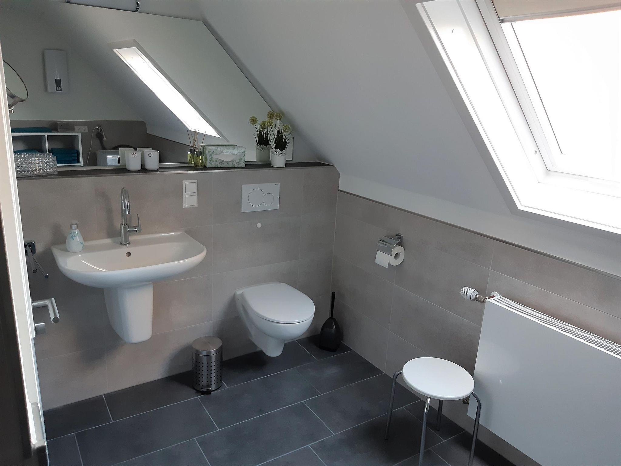 Neben dem Schlafzimmer liegt ein modernes Badezimmer mit bodentiefer Großraum-Dusche. Dort steht auch ein Waschtrockner zu Ihrer Verfügung.