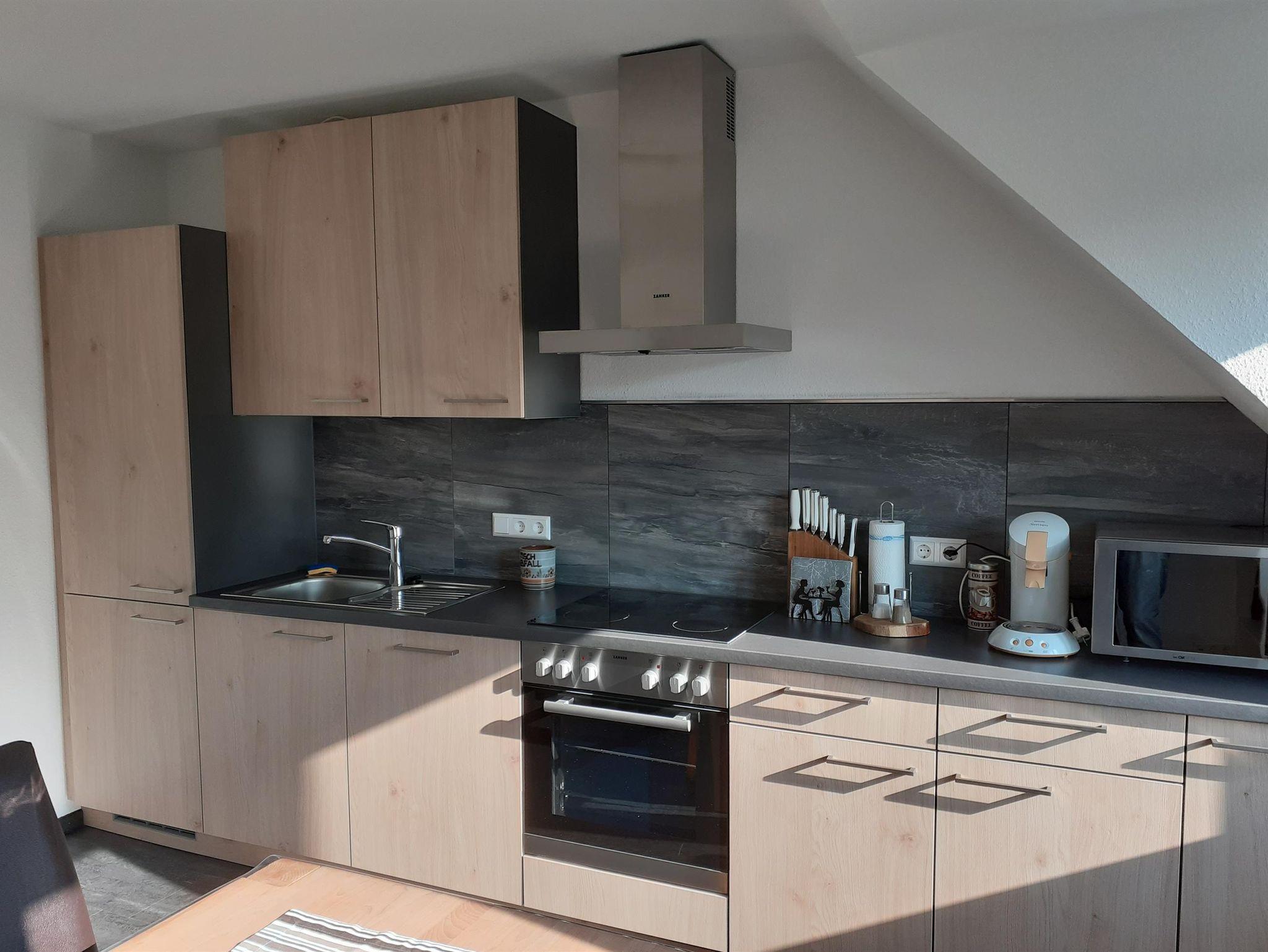 Nebenan befindet sich die gemütliche Küche mit gehobener Ausstattung und Blick ins Grüne auf den Stadtpark.