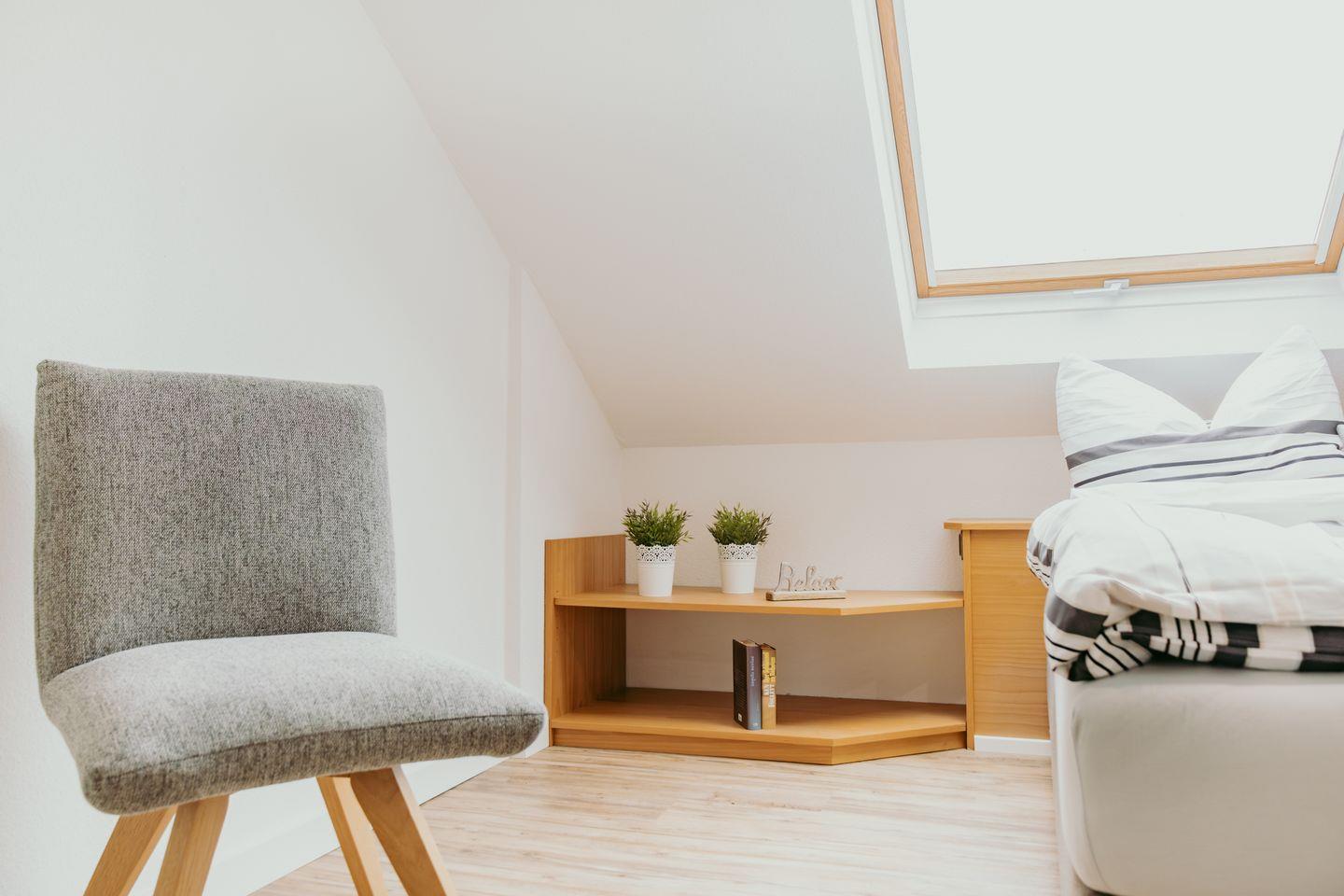 Das Wohn. und Esszimmer ist der Mittelpunkt der Wohnung. Hier startest du entspannt in den Tag, planst deine Ausflüge rund um den Edersee oder lässt den Abend gemeinsam ausklingen. Große Fenster holen viel Licht in den Raum und geben den Blick nach draußen frei. Ein großer Smart TV sorgt für entspannte Abende.