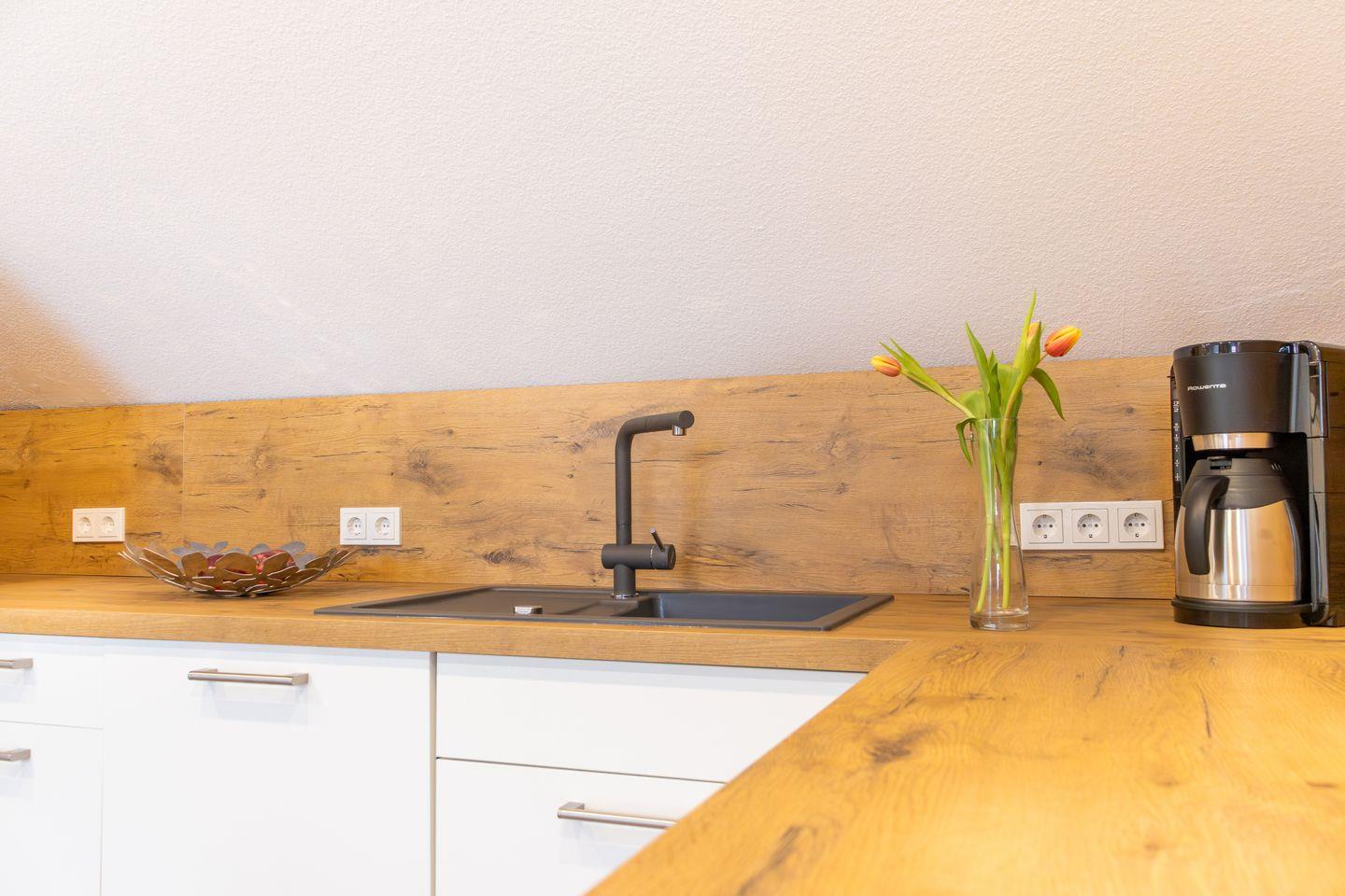 Direkt angrenzend liegt die separate, gut ausgestattete Küche. Hier bereitest du Mahlzeiten in Ruhe zu und bleibst trotzdem nah am Geschehen.