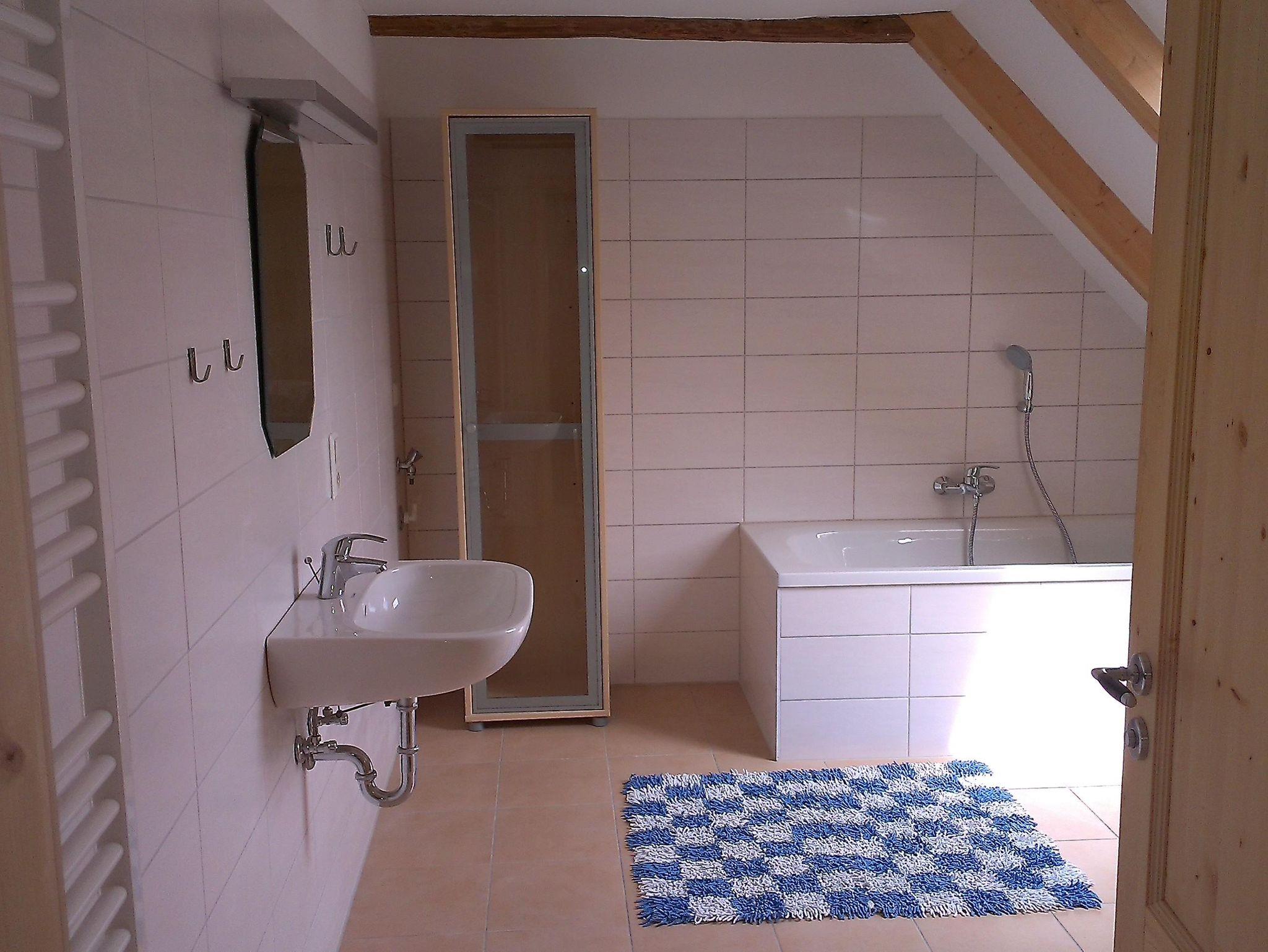 Im Dachgeschoss befindet sich ein weiterer Wohn-/ Schlafraum mit Schlafcouch und TV, das Bad mit WC, Dusche, Wanne und Waschtisch sowie ein weiteres Schlafzimmer mit 2 Einzelbetten und Zugangsmöglichkeit zum offenen Spitzboden mit Matratzenlager. Das Ferienhaus ist optimal für 2 bis 6 Personen geeignet.