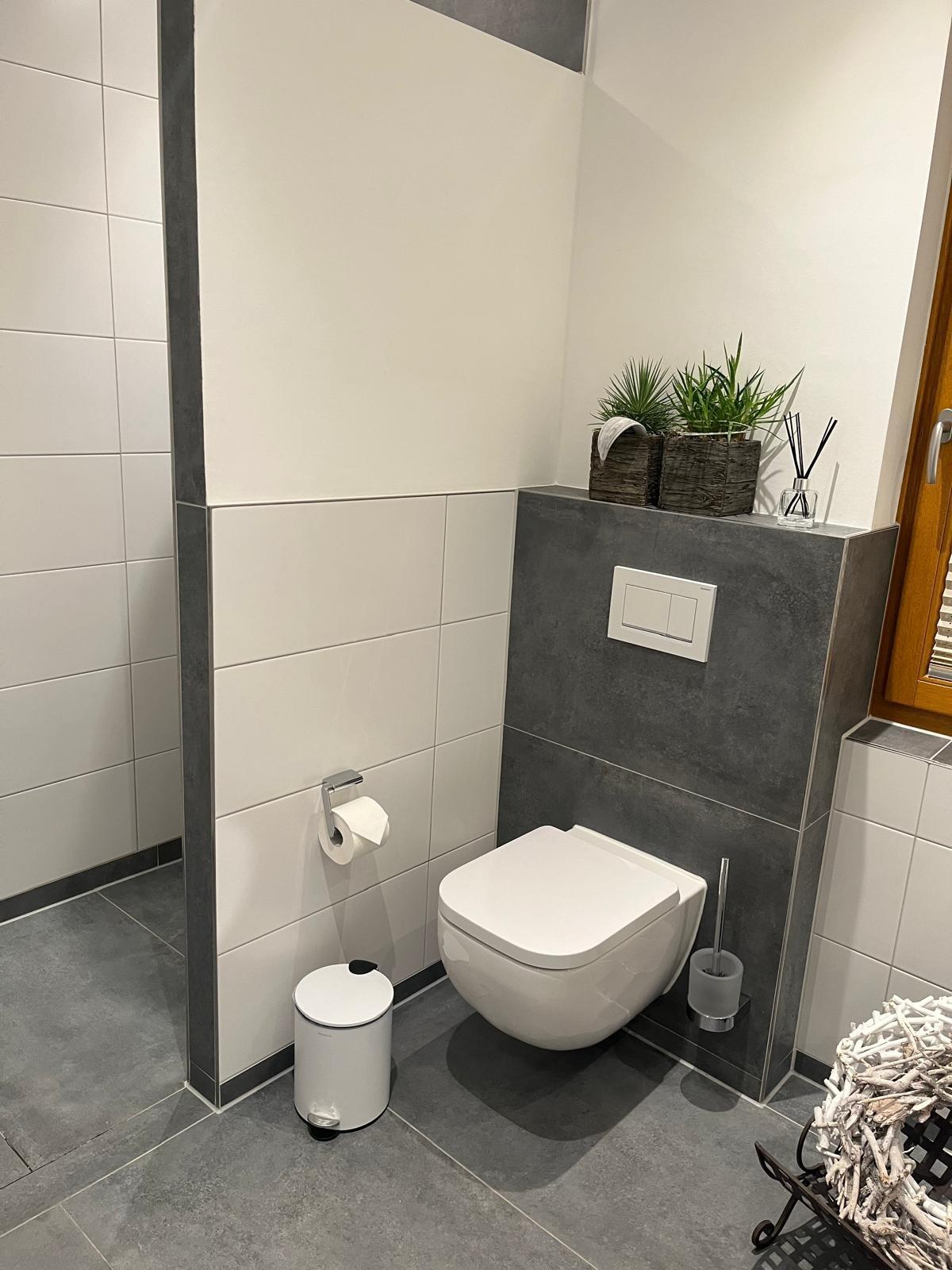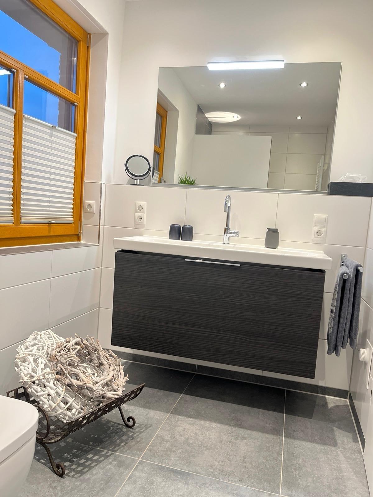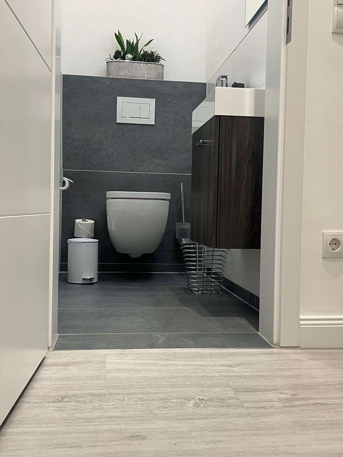 Es gibt ein großes Bad mit WC und Walk-In Dusche sowie ein separates WC. Beides ist mit großformatigen, italienischen Fliesen gefliest.