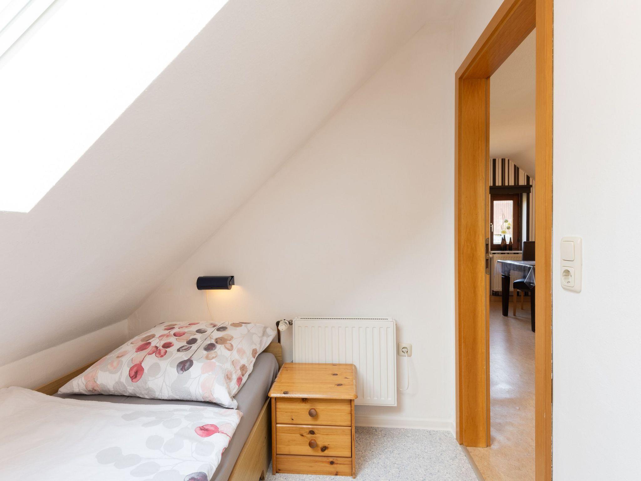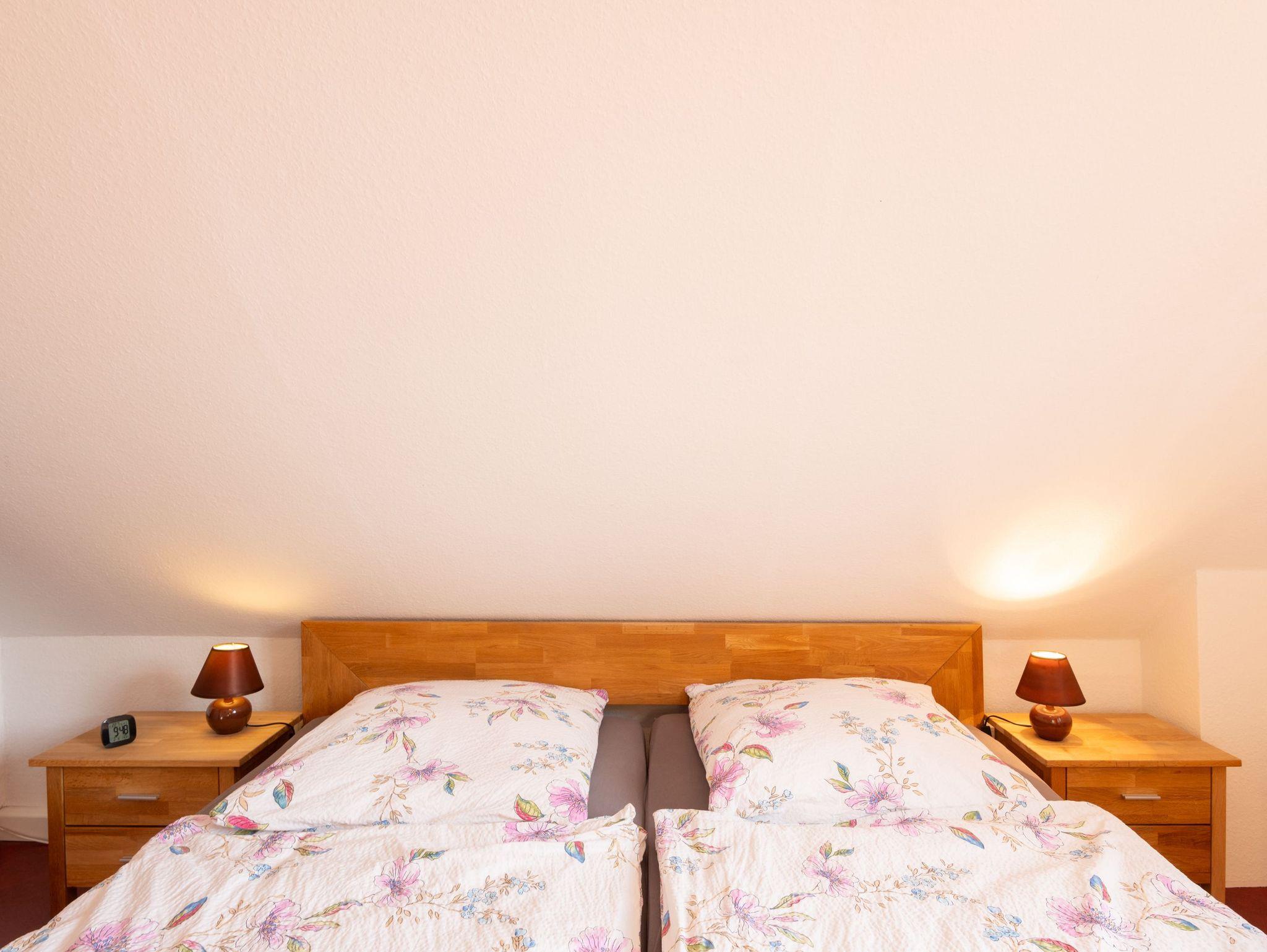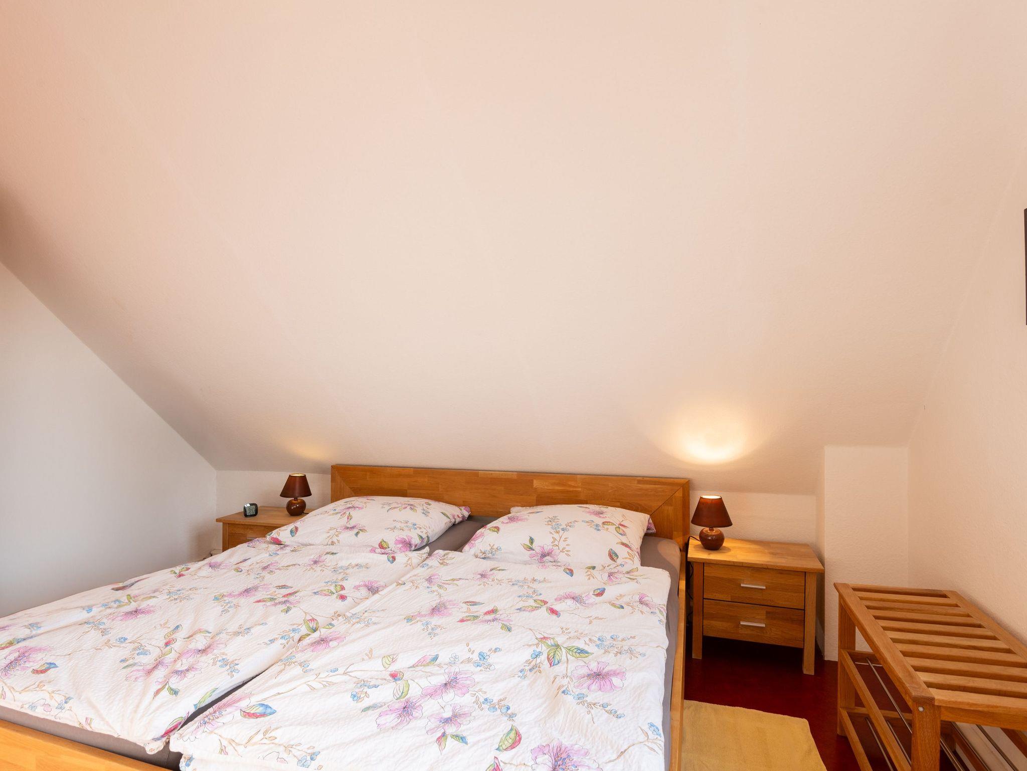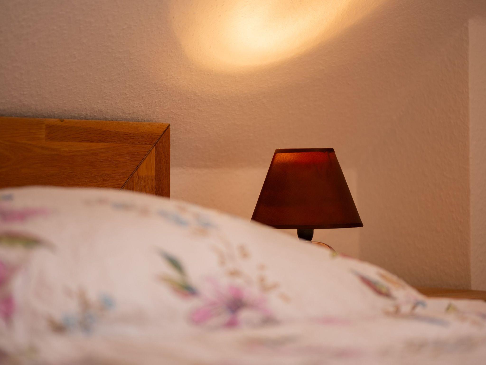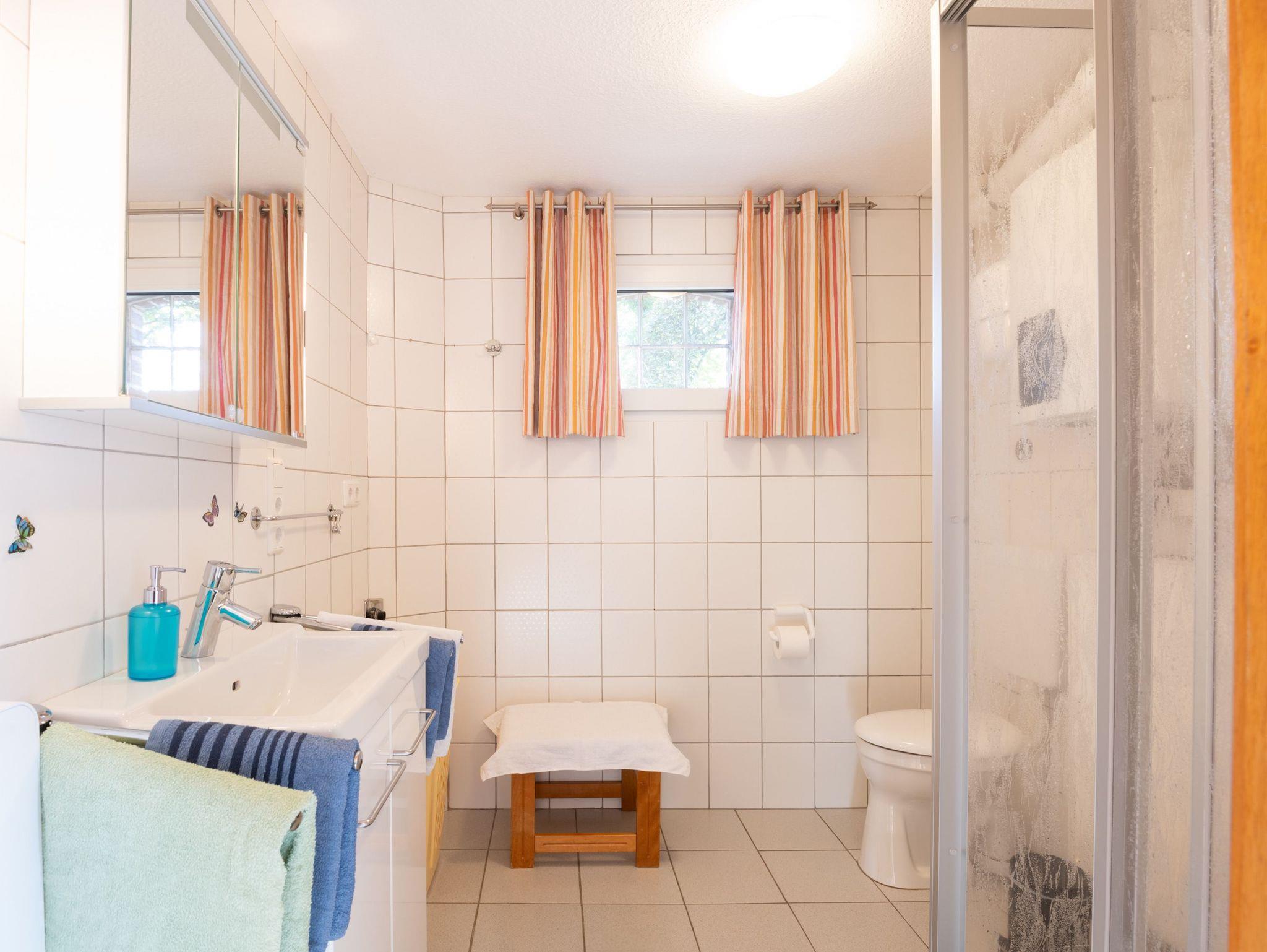 Ein Flachbildschirmfernseher (32 Zoll) und ein DVD-Radio stehen zur Verfügung. Im Schlafzimmer befindet sich ein Doppelbett (1,80 m x 2,00 m) mit Schrank und ein Zustellbett (passt platzmäßig zur Übernachtung aber nur in der Wohnküche). Im zweiten Schlafzimmer befindet sich ein Einzelbetten (0,90m x 2,00m). Im Badezimmer im Erdgeschoß befindet sich das Badezimmer mit einer Dusche (Einstiegshöhe 26 cm) und WC, einem Spiegelschrank sowie ein Waschbeckenunterschrank mit Stauraum. Im Eingangsbereich unten befindet sich ein Vorrats- und Aufbewahrungsschrank mit Bettwäsche, Handtücher, Staubsauger, usw.. Als Waschservice bietet die Vermieterin auf Anfrage für 3,00 EUR eine Waschmaschinenwäsche mit anschließendem Trocknung auf einem Wäscheständer an. Zur Ferienwohnung gehört eine gemütliche Sitzecke im Garten, direkt am Gartenteich mit Gartenmöbeln und einem Grill.