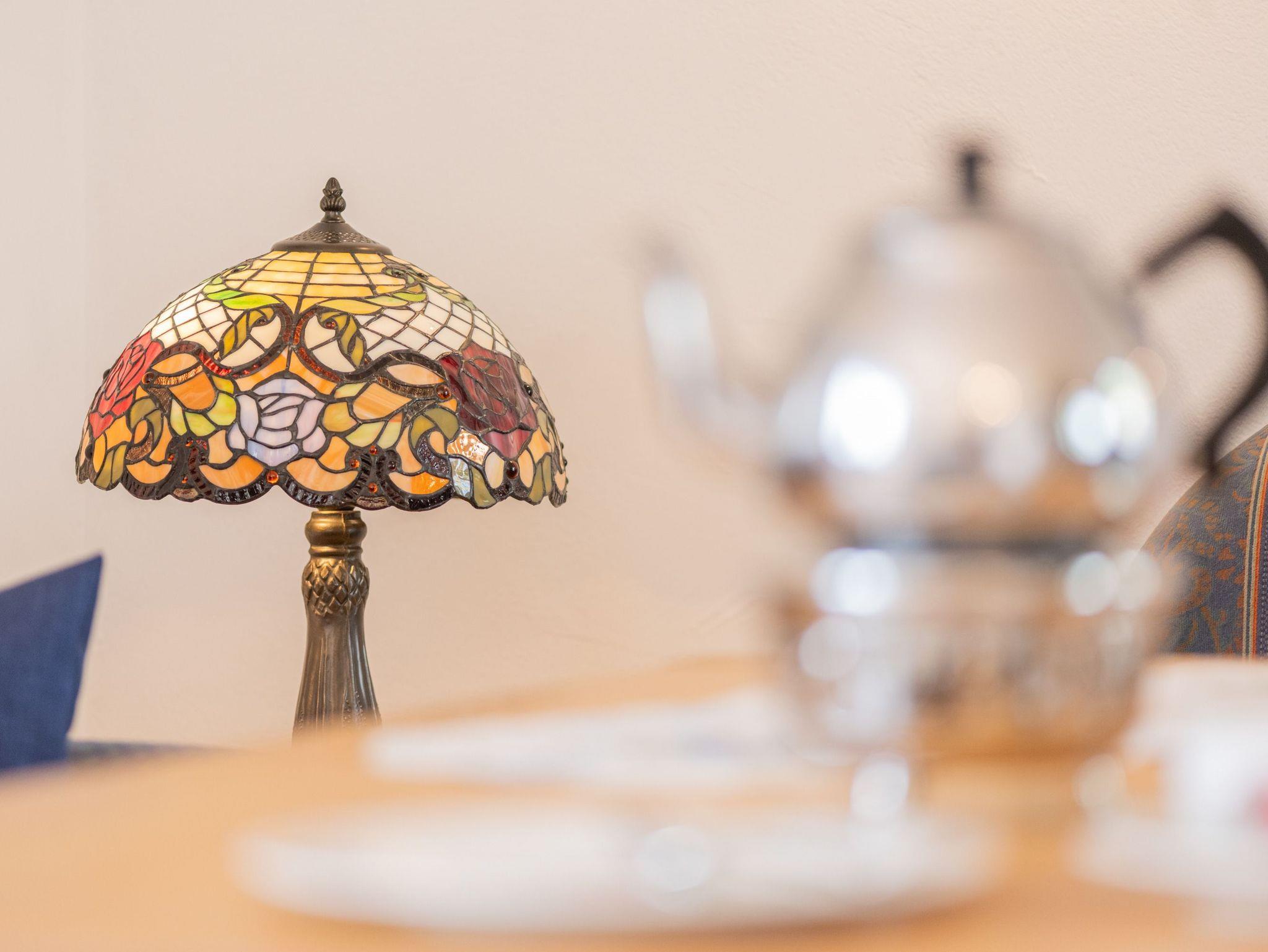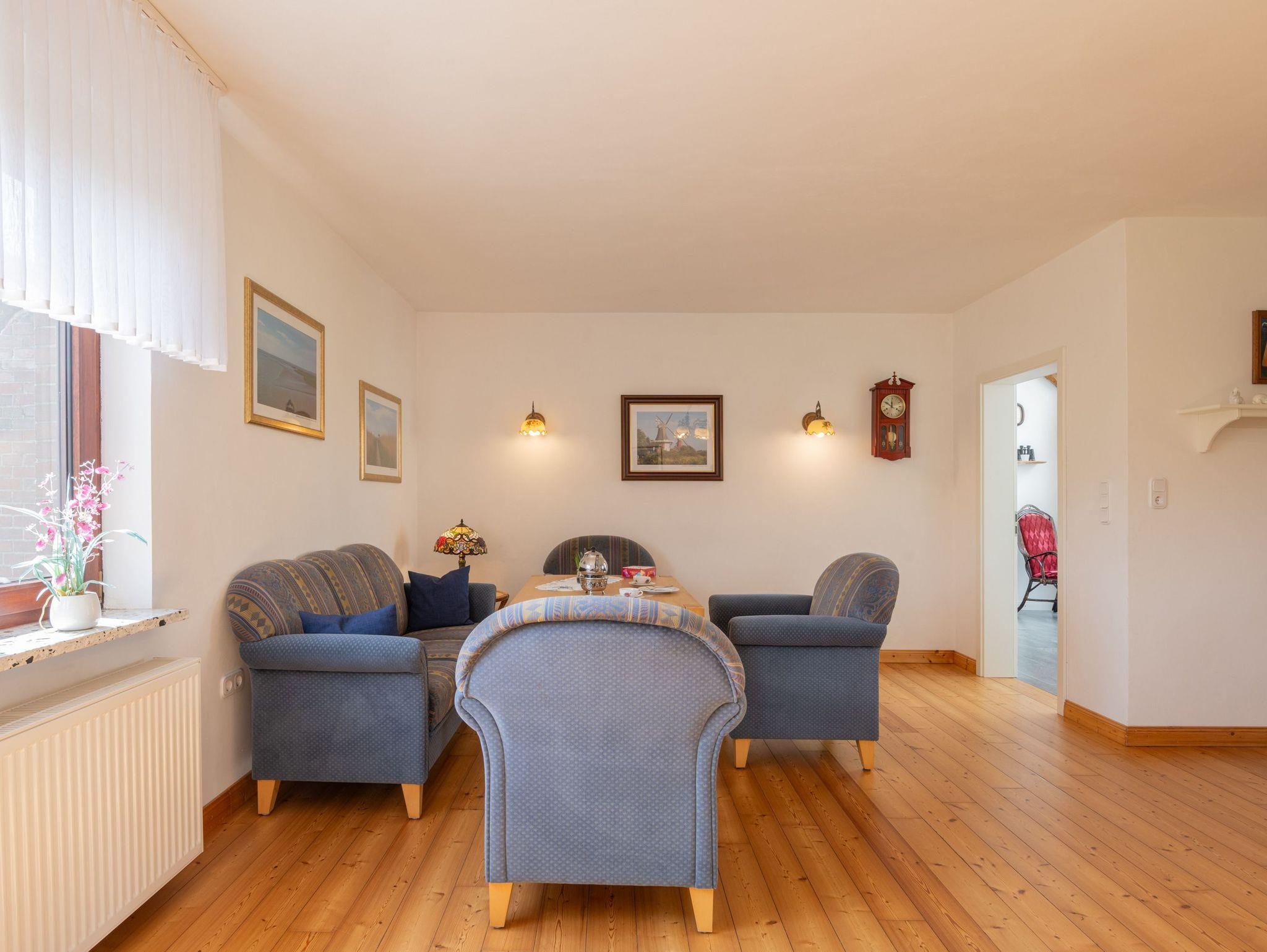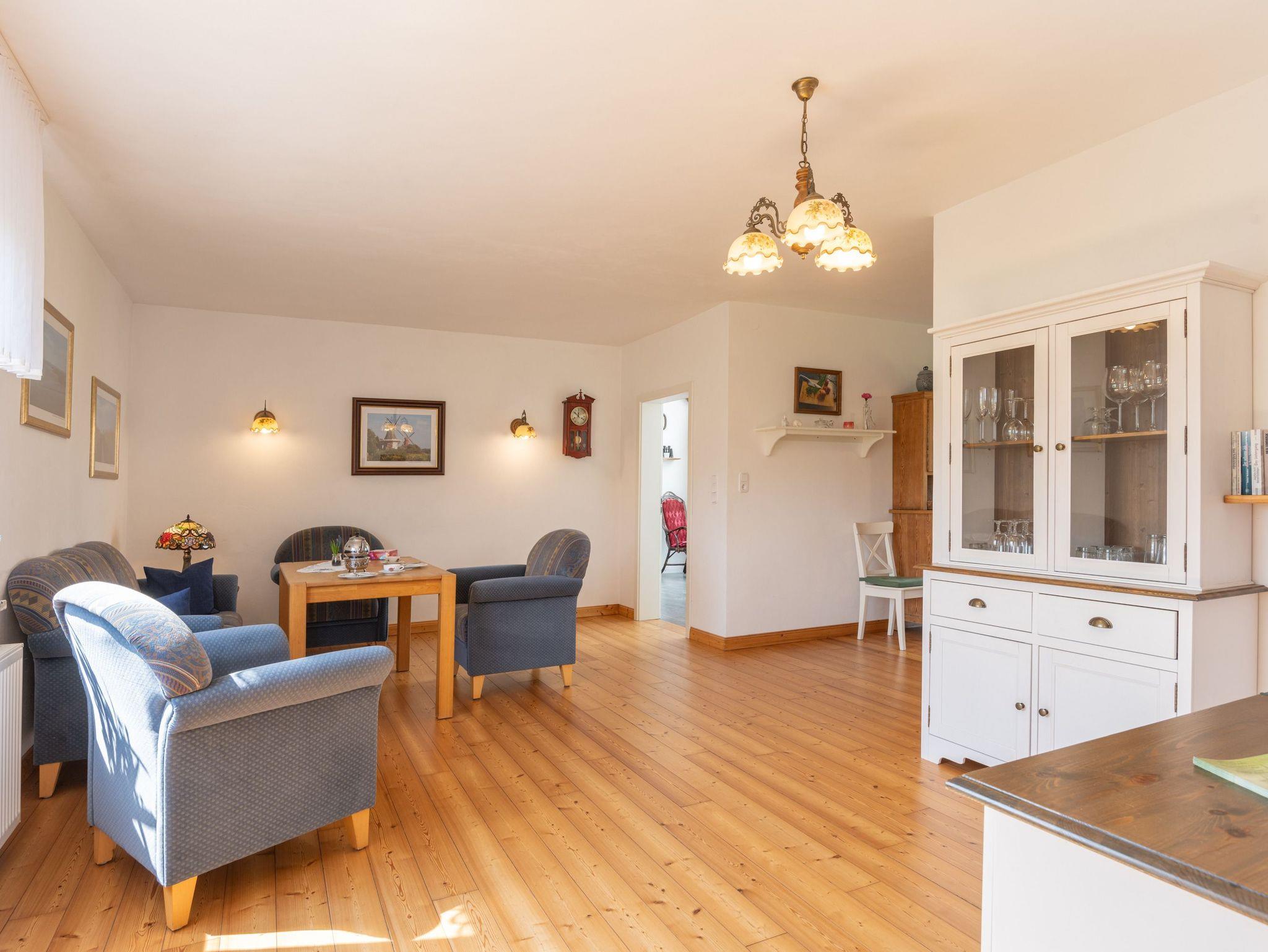 Zentral im Erdgeschoss befindet sich eine helle, gemütlich-moderne Wohnküche im Landhausstil. Der Wohnbereich ist ausgestattet mit einer gemütlichen Sitzgarnitur und einem Flachbildschirmfernseher. Der Küchenbereich ist mit einer Einbauküche und diversen Zusatzgeräten komplett ausgestattet. Ein kleiner Gefrierschrank steht im Abstellraum.