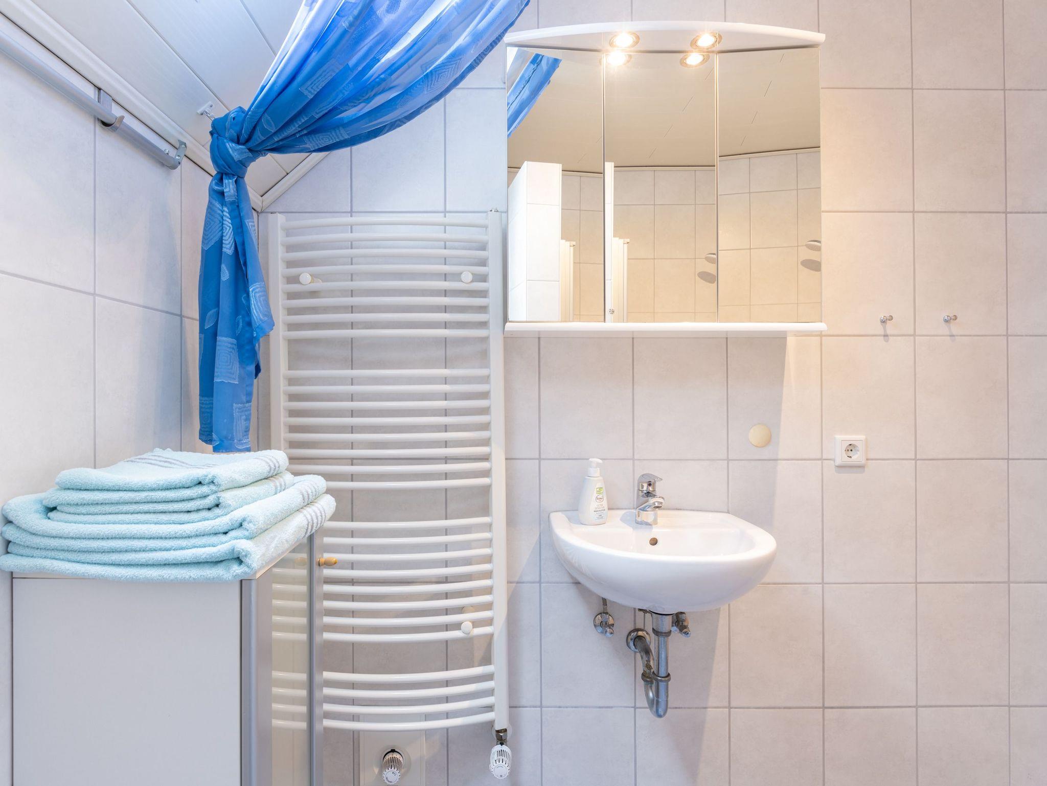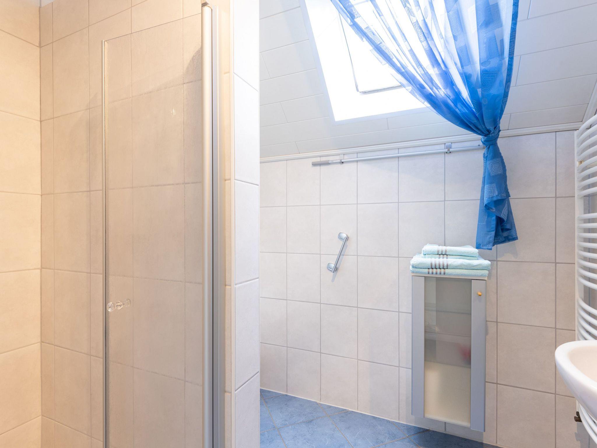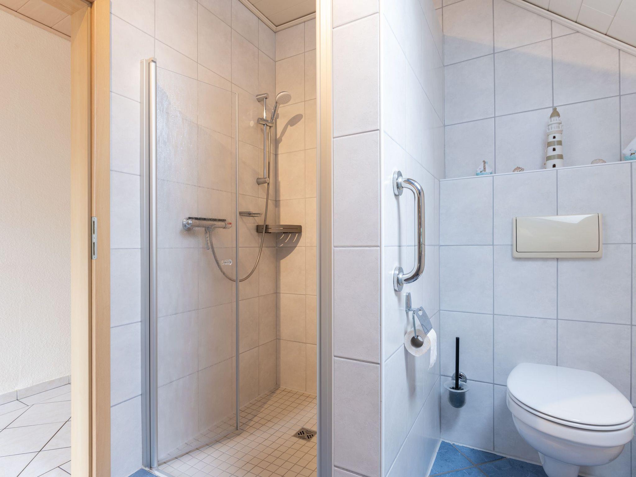 Die Dusche im Bad hat einen ebenerdigen Einstieg und im Bereich des WC befindet sich ein Haltegriff als Aufstehhilfe.