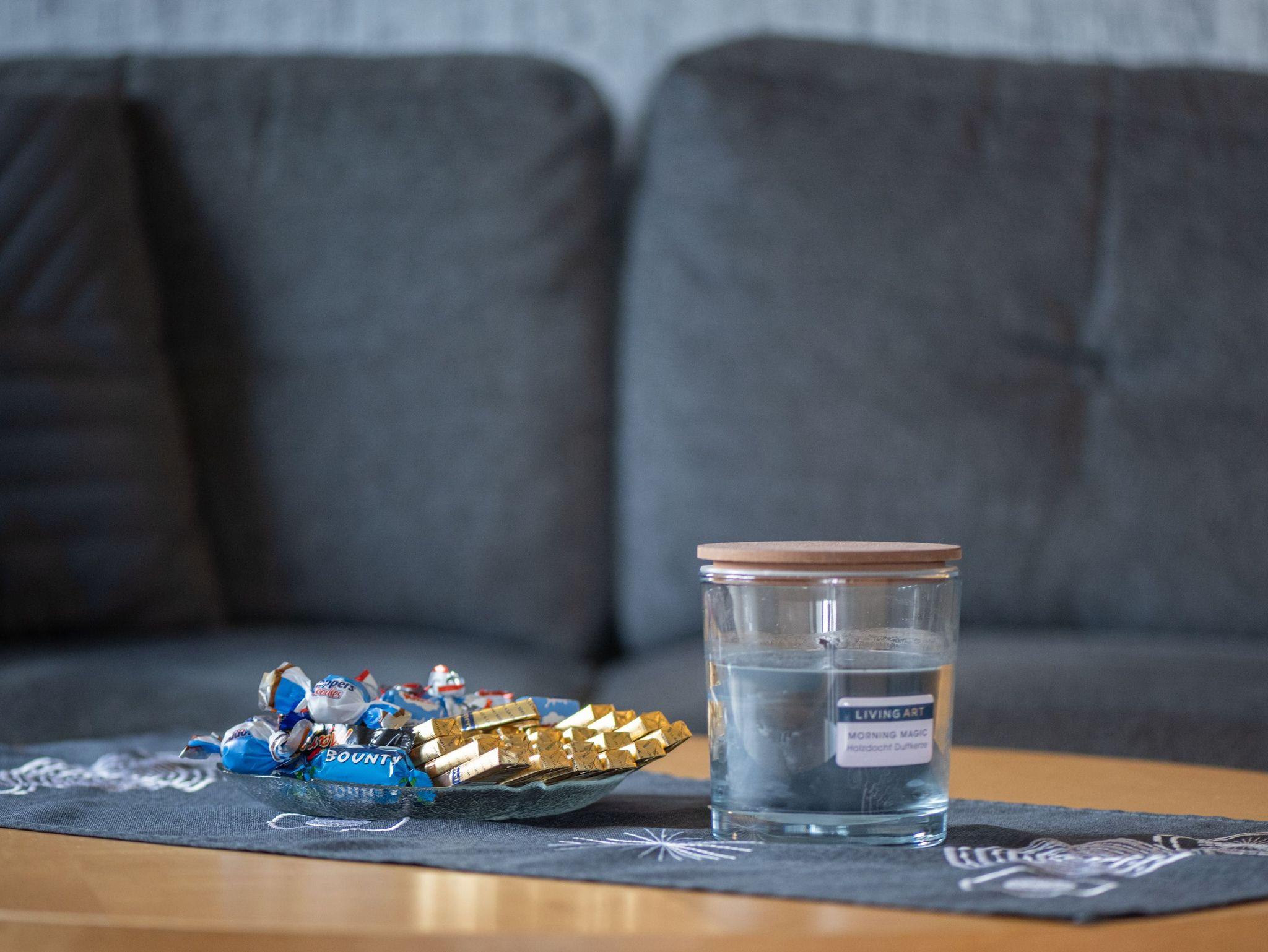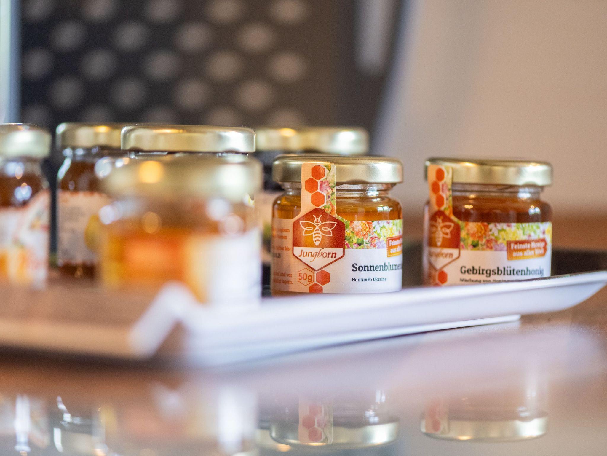 Frühstücksset (Kaffeemaschine, Wasserkocher und Toaster) und ein Unterbauradio mit CD. Eine kleine Auswahl an verschiedenen Teesorten, Marmelade und Honig stellen wir