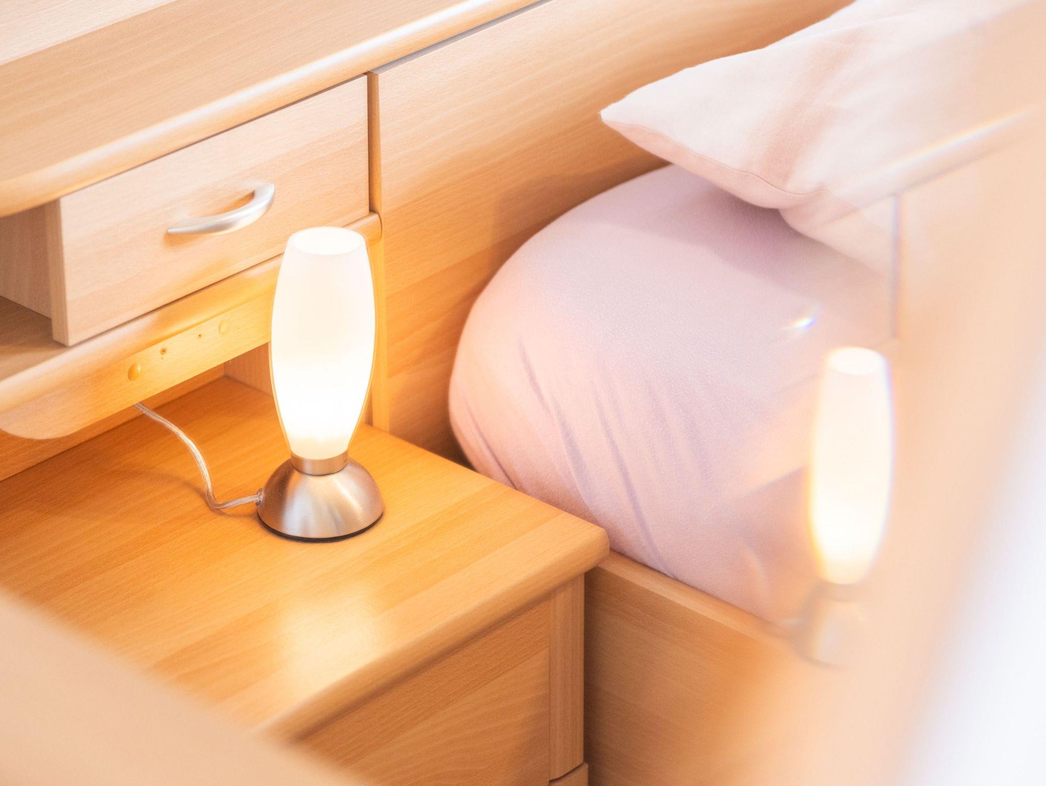 Im Schlafzimmer stehen ein großer Kleiderschrank und ein Doppelbett (2,00 x 2,00 m) mit normaler Einstiegshöhe.
