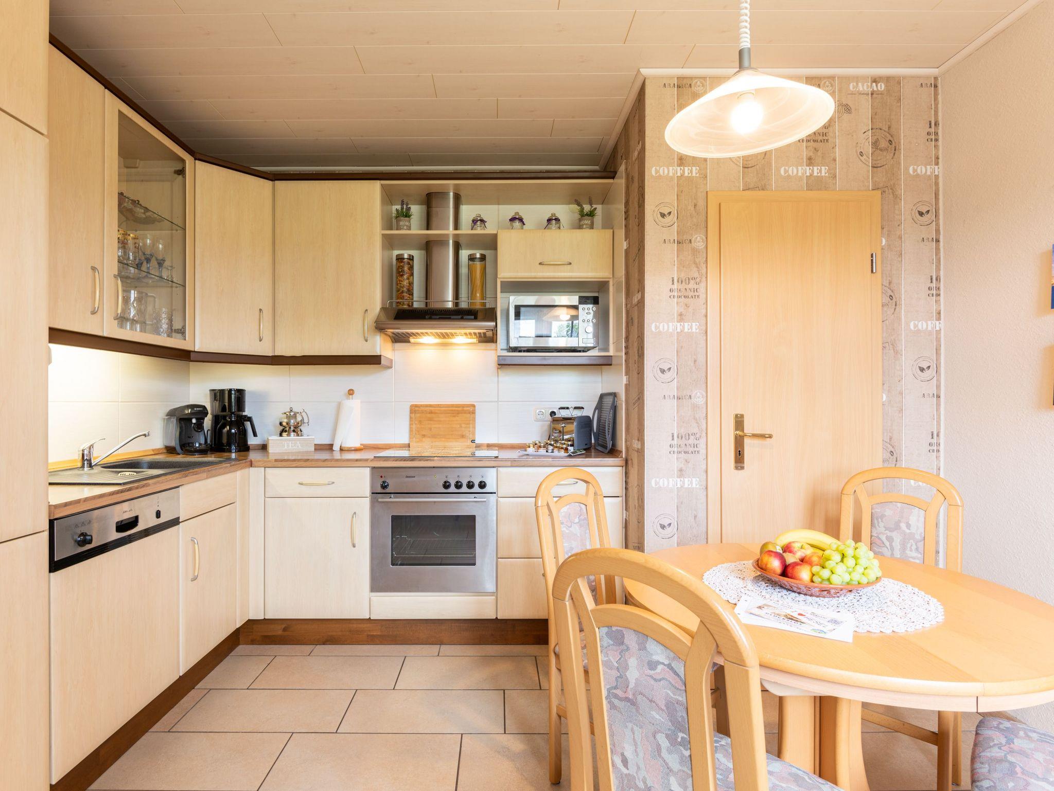 kostenlos zur Verfügung. In der Küche stehen ein Esstisch (rund, ausziehbar) und vier Stühle.