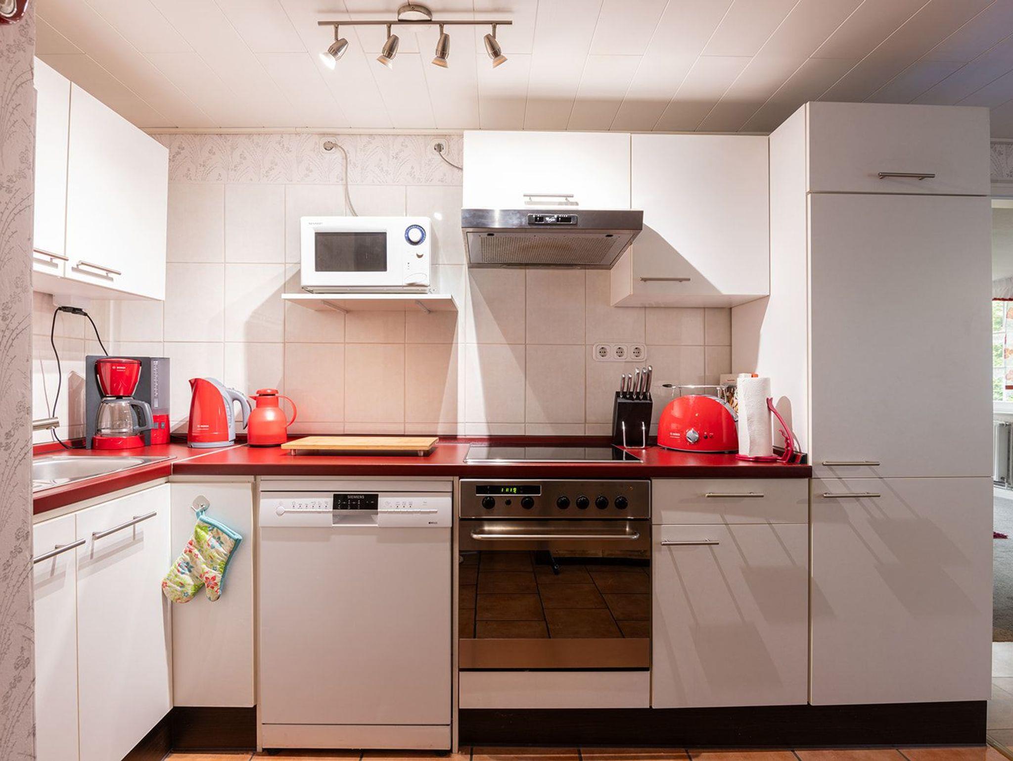 Die im Küchenbereich vorhandenen Geräte (E- Herd, Geschirrspülmaschine, Kühlschrank, Microwelle, Heißwasserkocher, Kaffeemaschine, Toaster, Eierkocher, Stabmixer und Handmixer) sowie Geschirr und