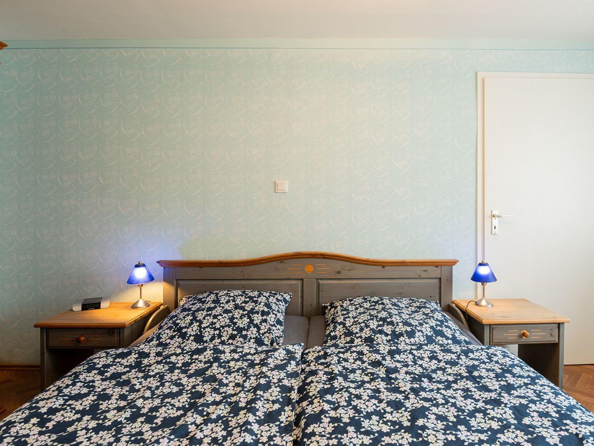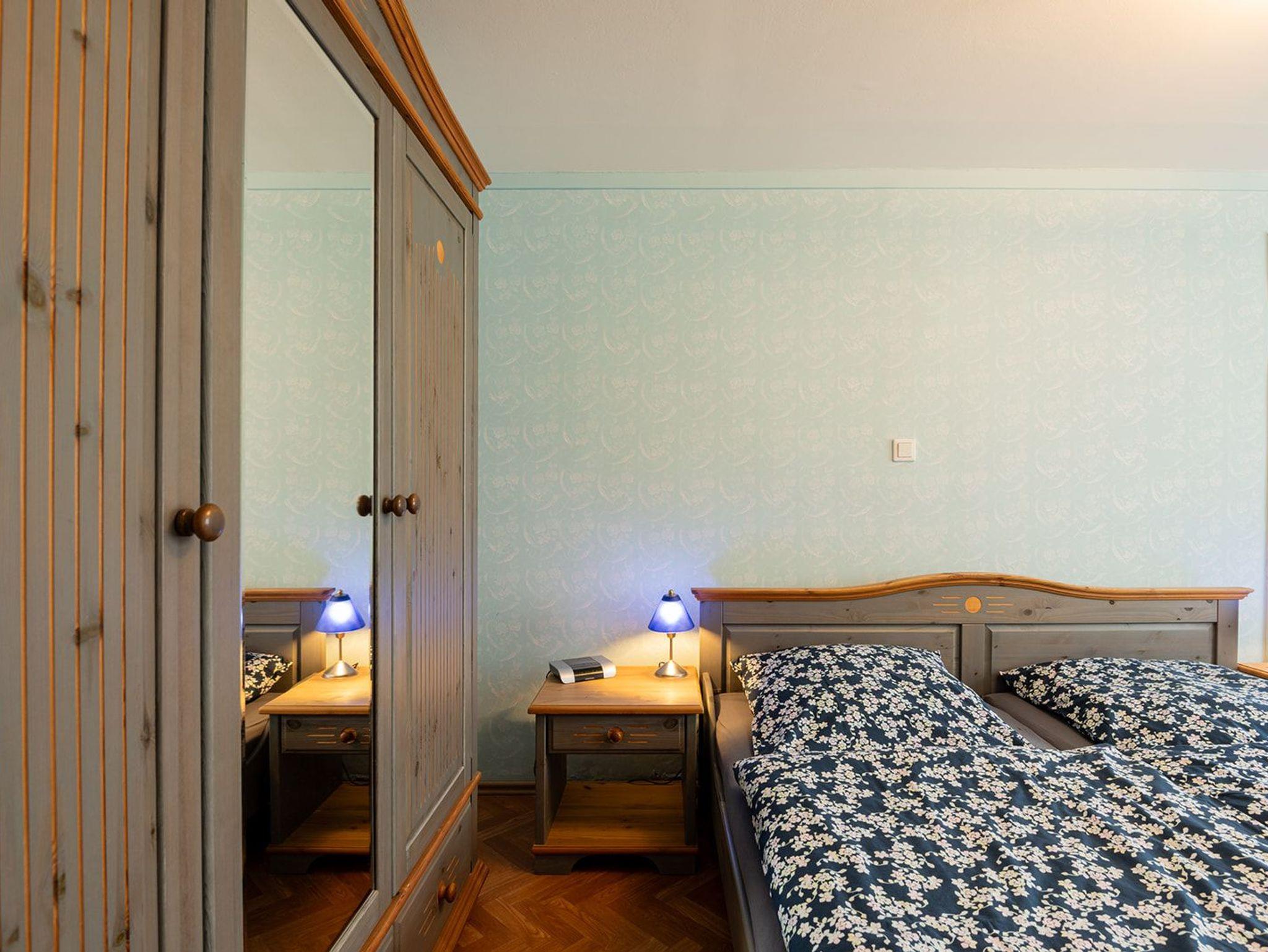 Im angrenzenden Schlafzimmer befindet sich ein Doppelbett (1,80 x 2,00 m). Ein Kleiderschrank mit Spiegeltür sowie ein Tisch mit 2 Stühlen sind ebenfalls vorhanden. Eine Kofferablage rundet den Bereich ab.