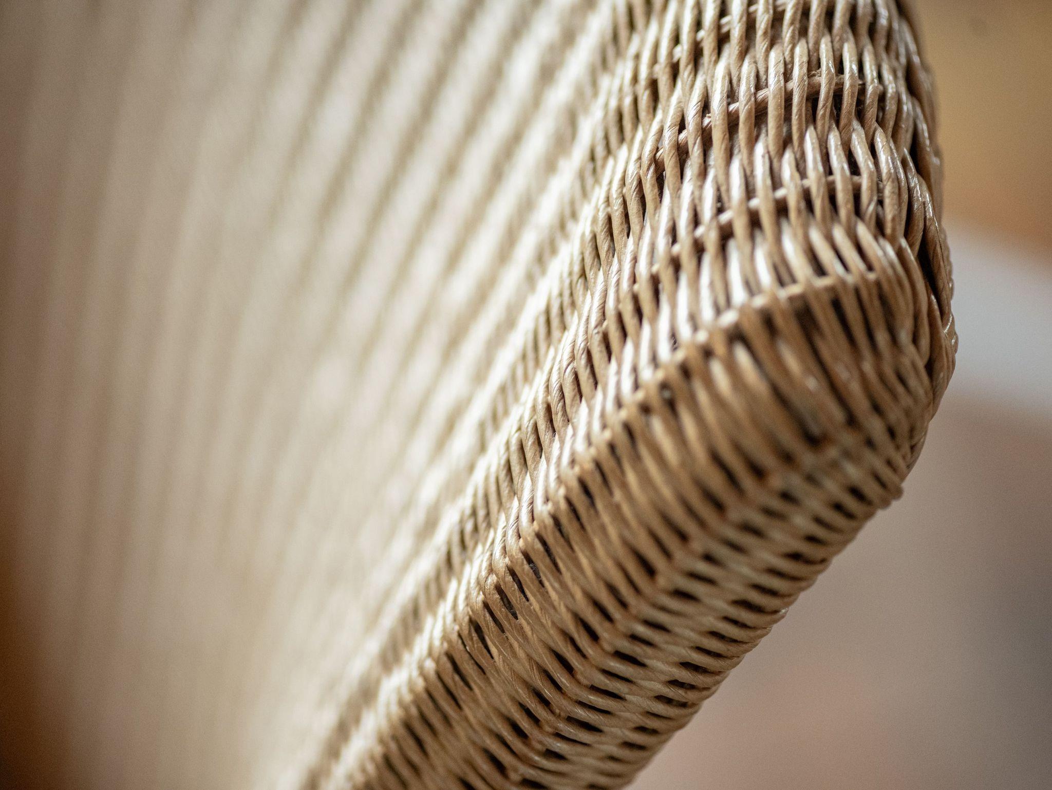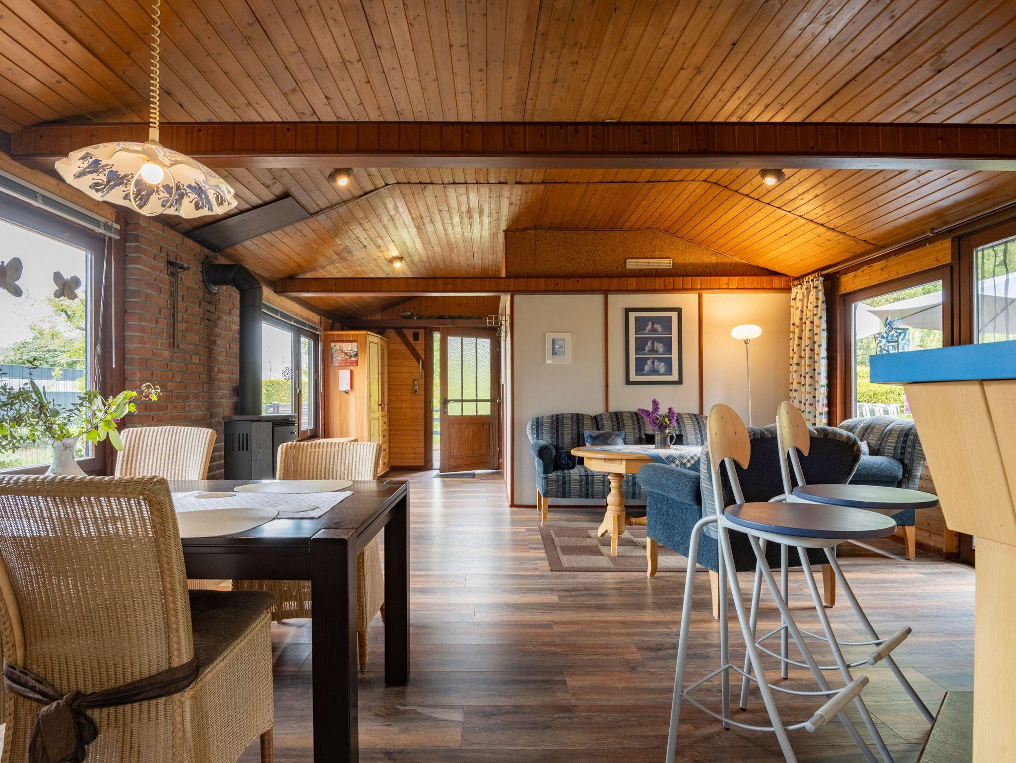 Der Wohnraum ist lichtdurchflutet und hat einen kleinen Kaminofen für die kühleren Abende. Eine gemütliche Wohngarnitur (Ostfriesensofa mit zwei einzelnen Sesseln) und ein rechteckiger Esstisch mit vier Korbstühlen befinden sich im Wohn-/Küchenbereich.