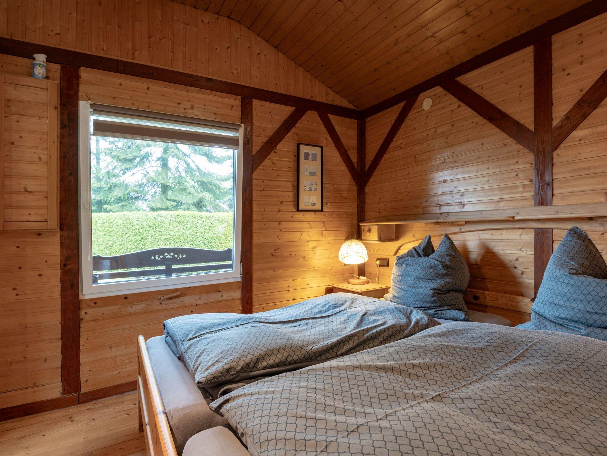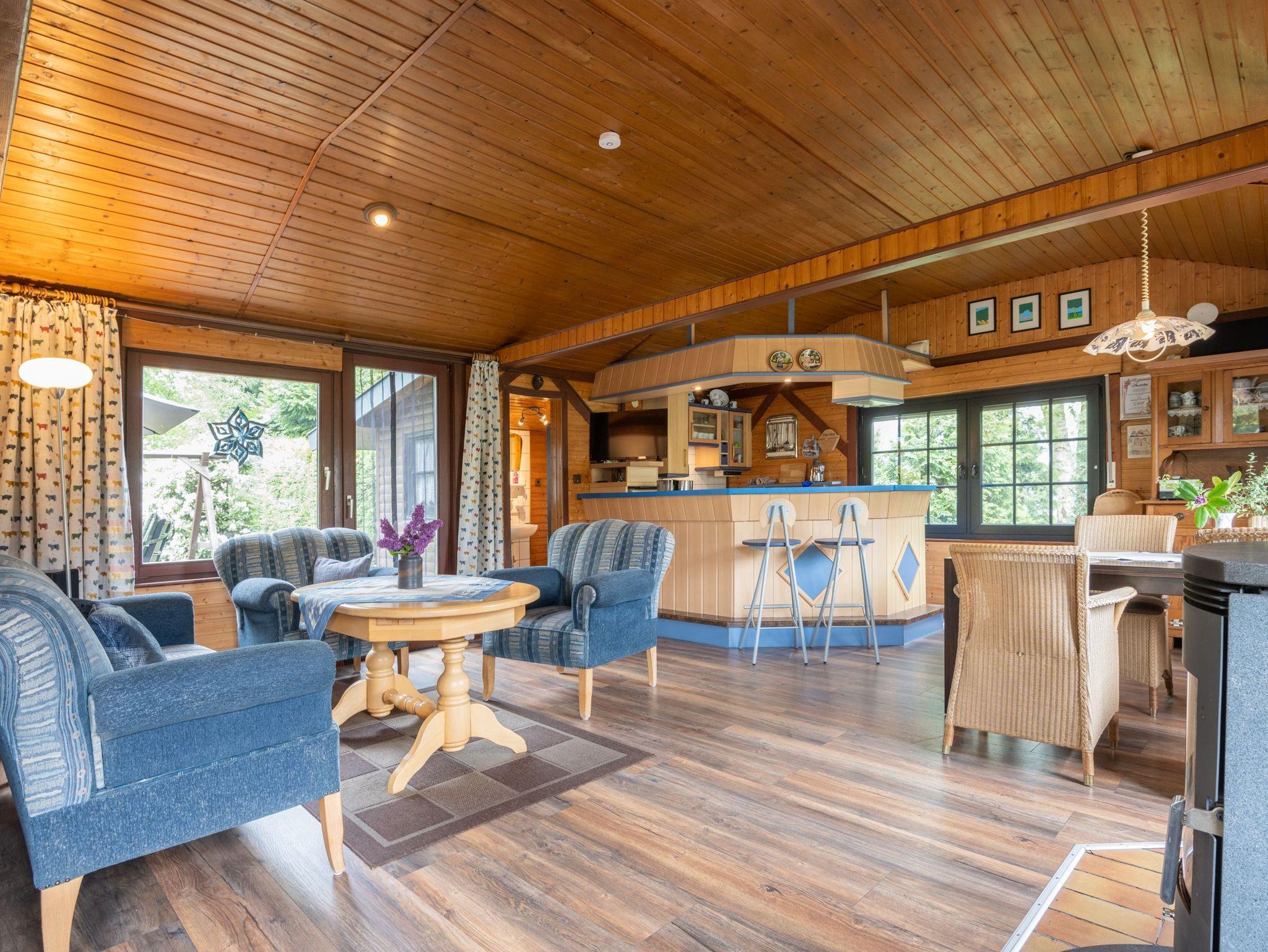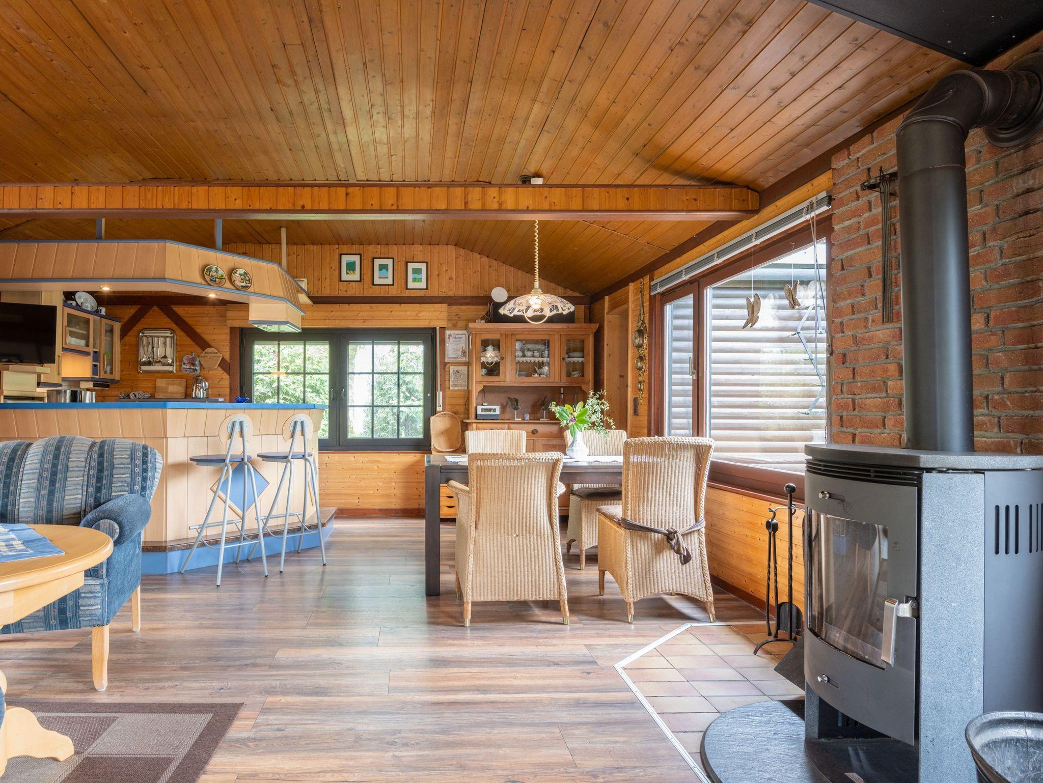 Das Blockhaus verfügt über zwei sep. Schlafräume und einen großen Wohngereich mit einer offenen Küche, die sich im halbkreis und durch eine Theke abgrenzt. Der Wohnraum ist lichtdurchflutet und hat einen kleinen Kaminofen für die kühleren Abende. Eine gemütliche Wohngarnitur (Ostfriesensofa mit zwei einzelne Sessel) und ein rechteckiger Esstisch mit vier Korbstühlen befinden sich im Wohn-/Küchenbereich. Ein Schlafraum verfügt über ein Doppelbett (1,80m x 2,00m) und im zweiten sep. Schlafraum stehen zwei Einzelbetten (0,90m x 2,00m) zur Verfügung. Neben dem Küchenbereich befindet sich ein kleines Badezimmer mit Dusche und WC.
