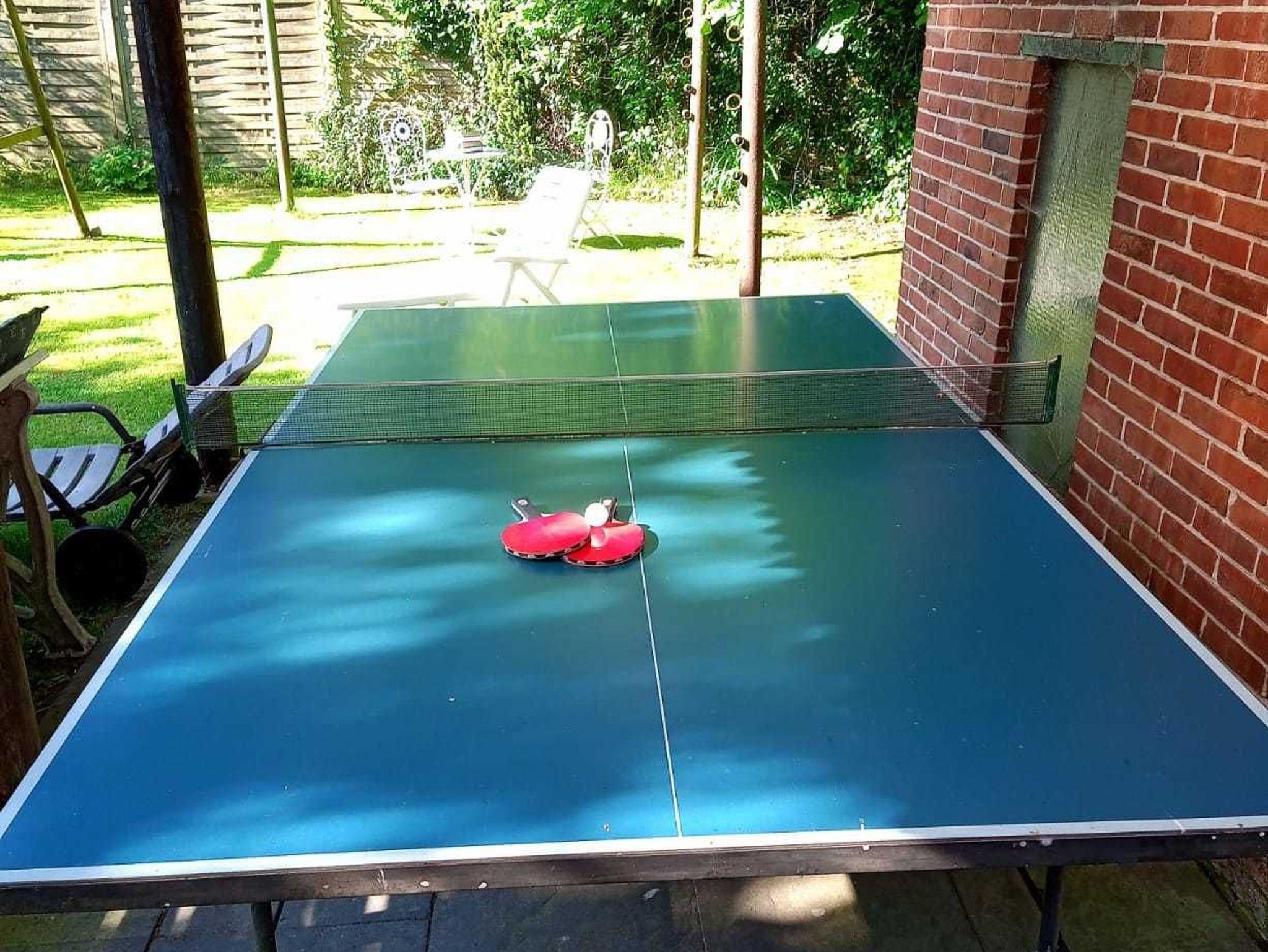 Der große Gartenbereich wird zur Straße hin von einer hohen Hecke begrenzt und ist nicht einsehbar. Hier kann man auf den Gartenliegen die Ruhe genießen oder auch sich an der Tischtennisplatte ein Match liefern.