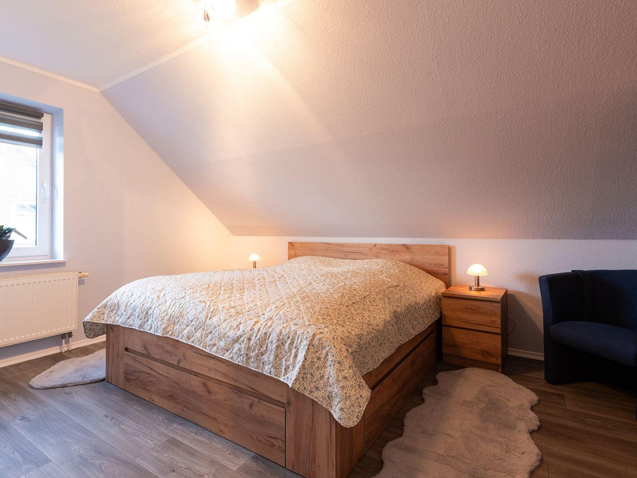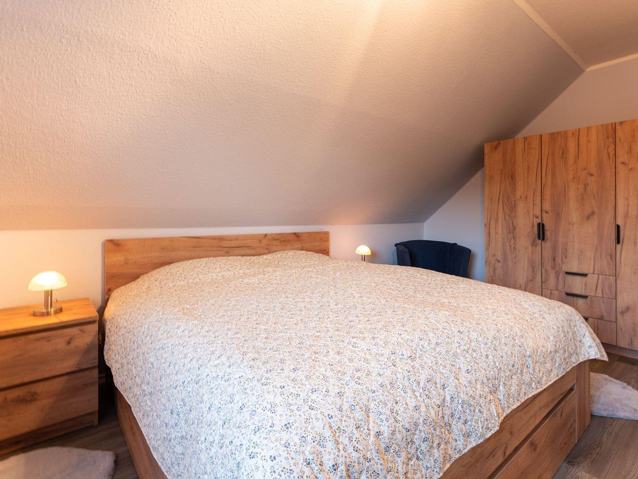 Im Schlafzimmer finden zwei Erwachsene bequem Platz. Die Schlafcouch im Wohnzimmer bietet eine zusätzliche Schlafmöglichkeit für eine dritte Person.