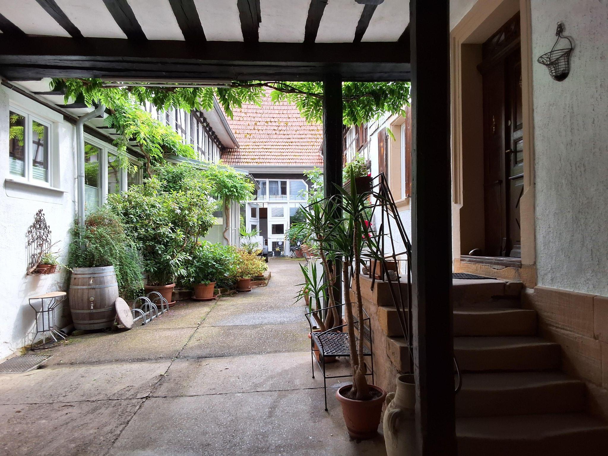 Orginelle Wohnung in einem separaten Nebengebäude, im Fachwerkstil. Neu renoviert mit integriertem Wintergarten. 4 Zimmer, Küche,Bad. Idyllischer ruhiger Innenhof in mediterraner Atmosphäre eines früheren Winzeranwesens.